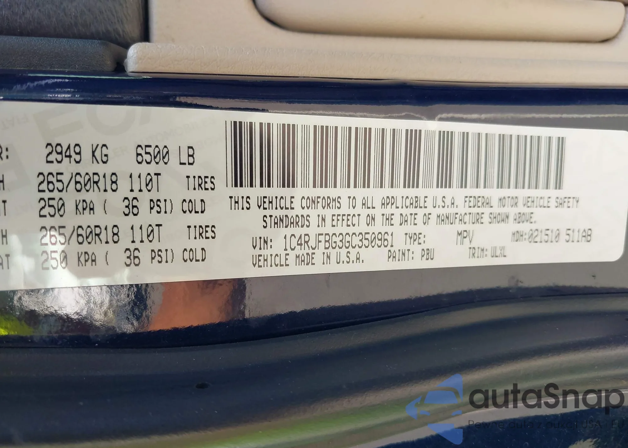 • VIN 1C4RJFBG3GC350961