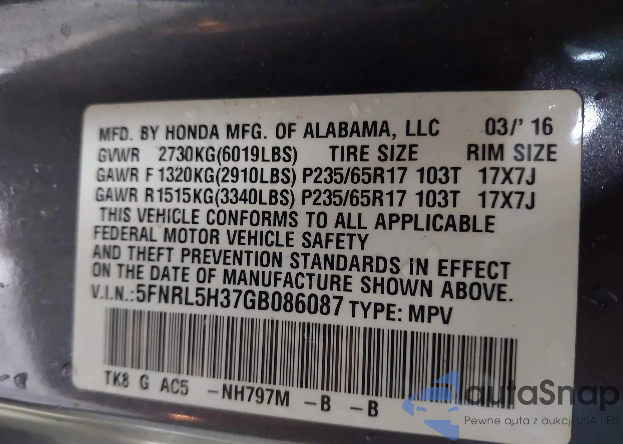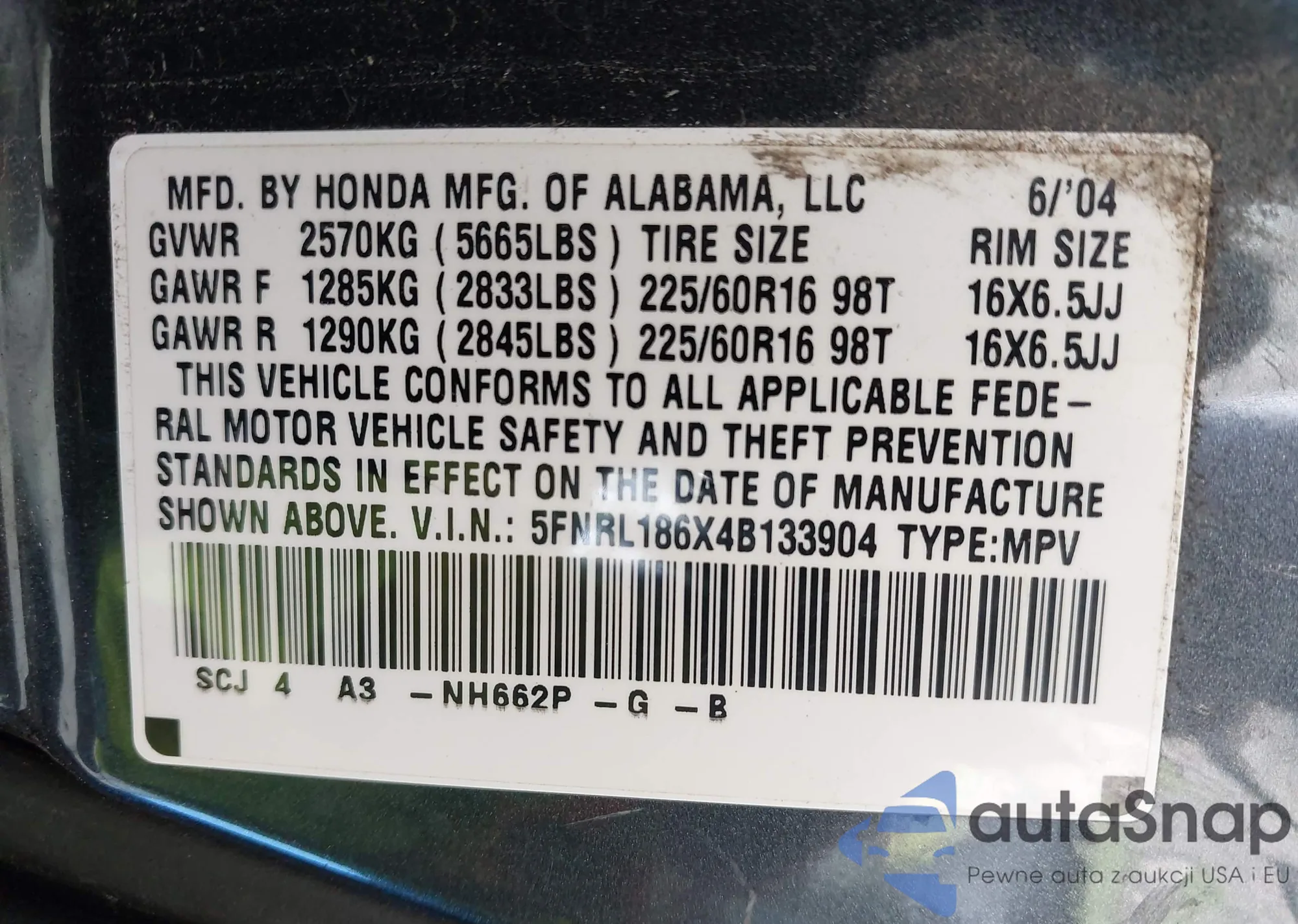LOT: 42771048 VIN: 5FNRL186X4B133904
