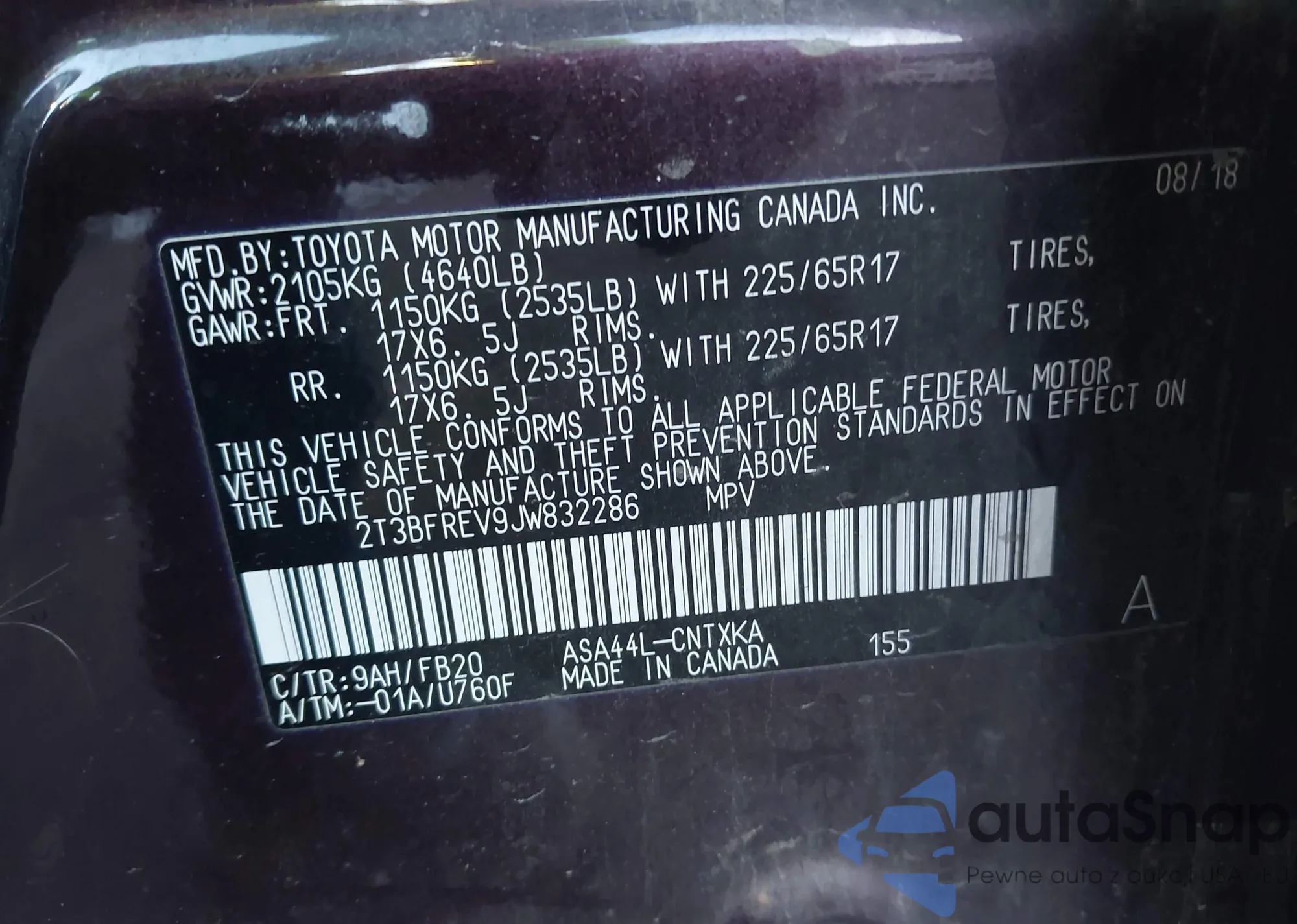 LOT: 41322827 VIN: 2T3BFREV9JW832286
