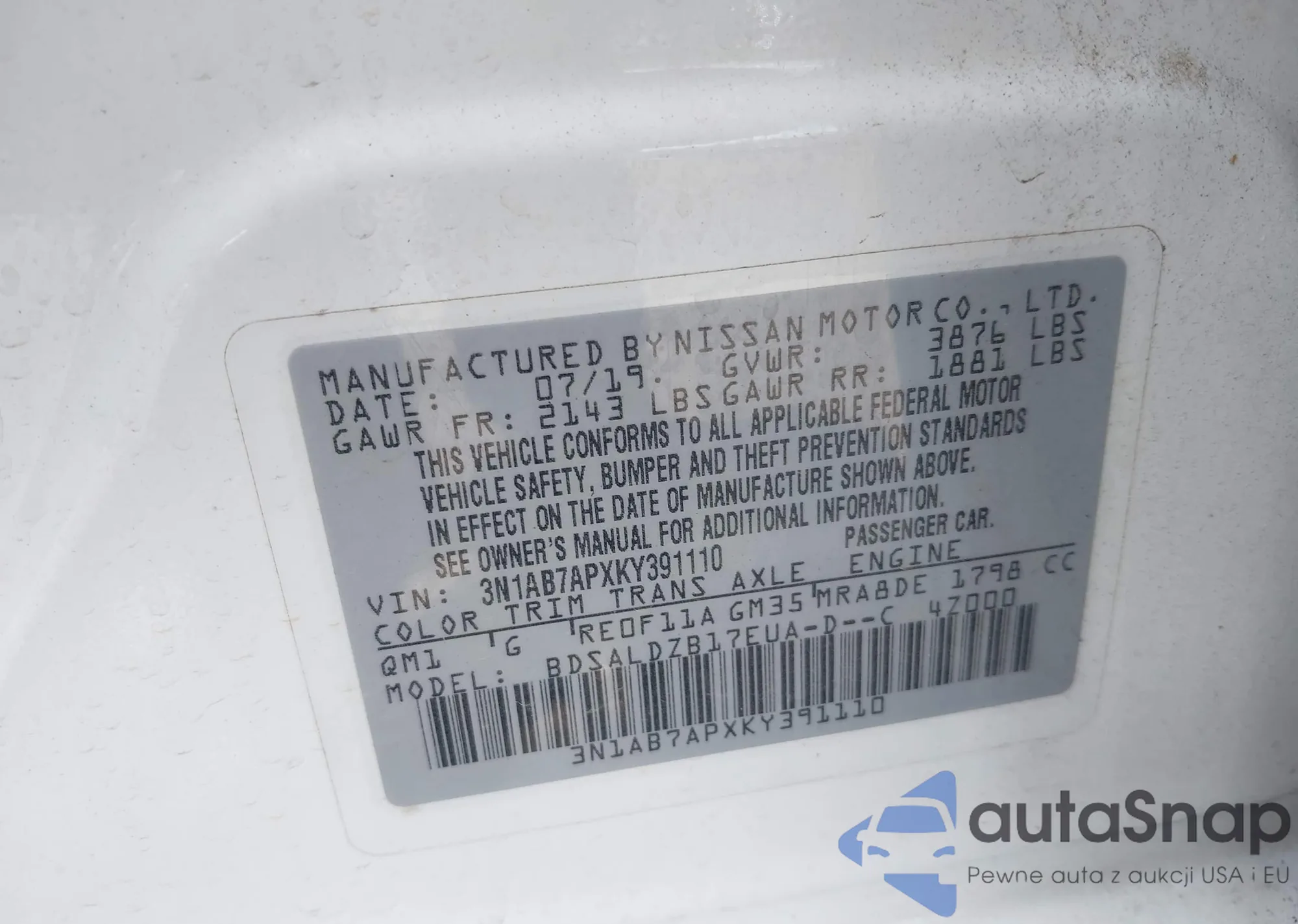 LOT: 42874616 VIN: 3N1AB7APXKY391110
