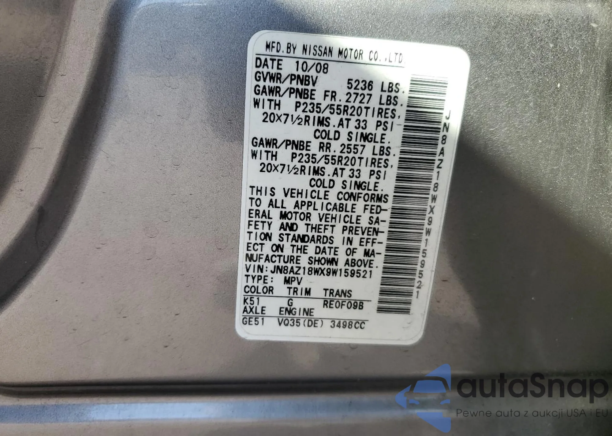 LOT: 71103205 VIN: JN8AZ18WX9W159521