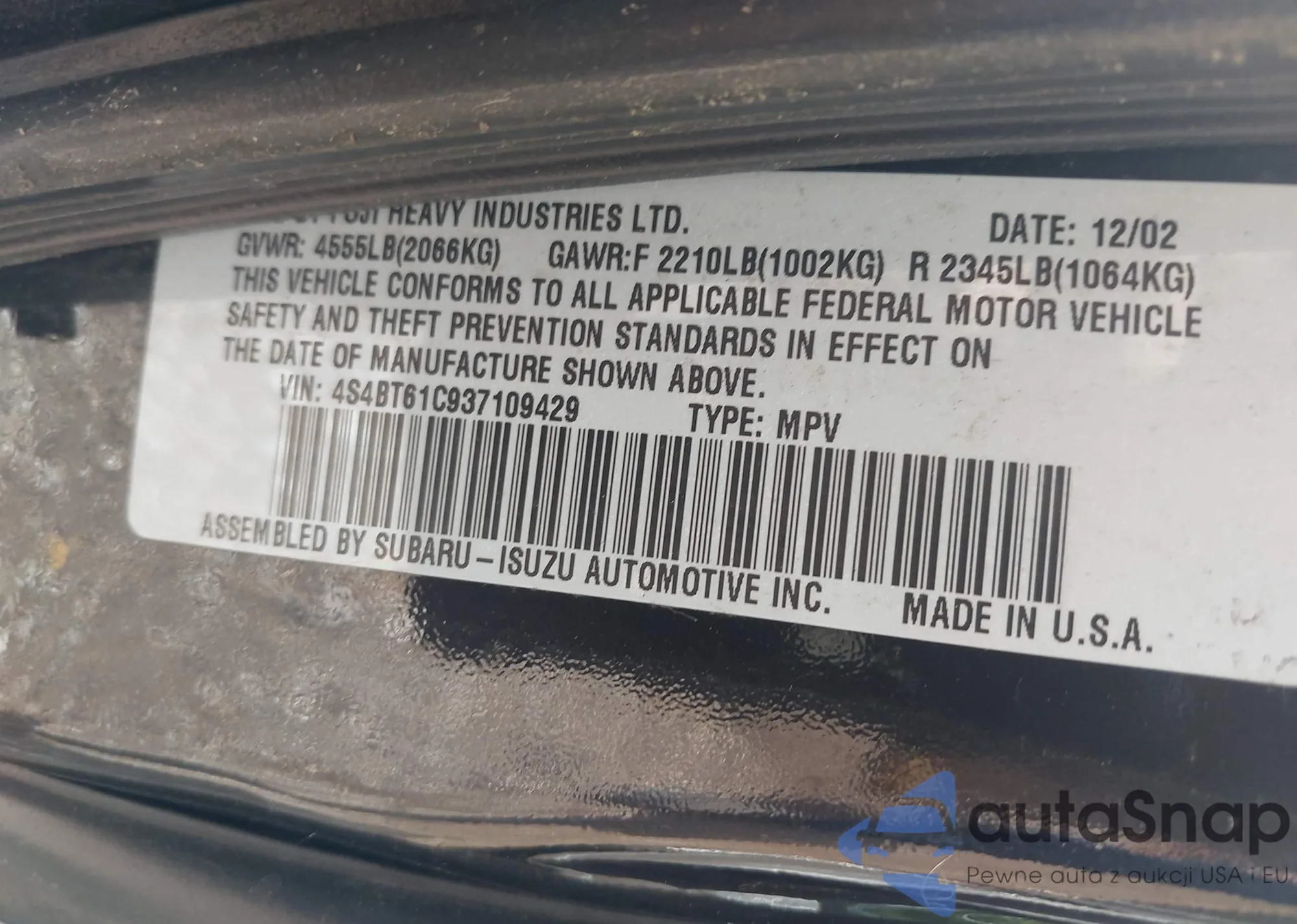 LOT: 42466745 VIN: 4S4BT61C937109429