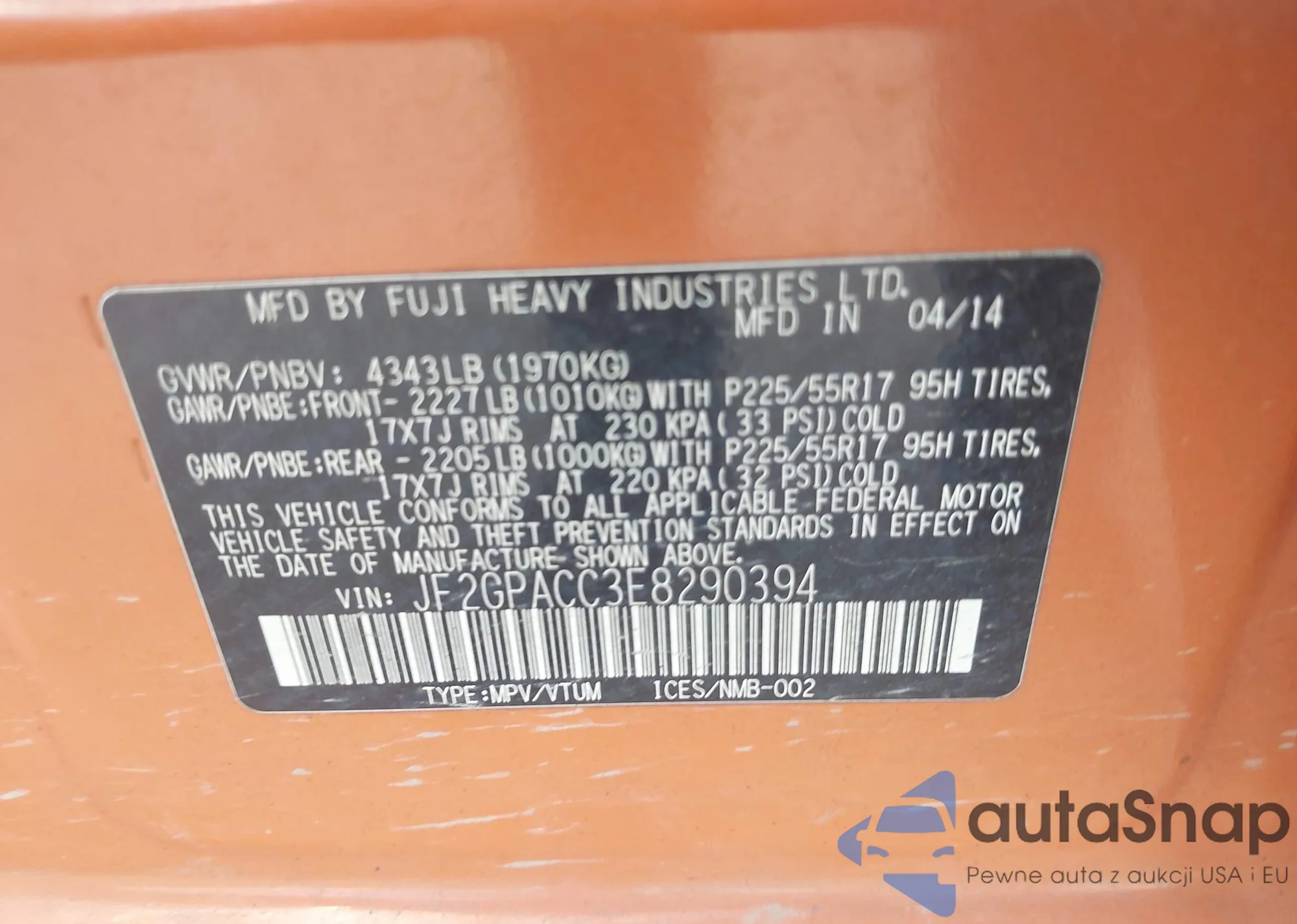 LOT: 42976397 VIN: JF2GPACC3E8290394