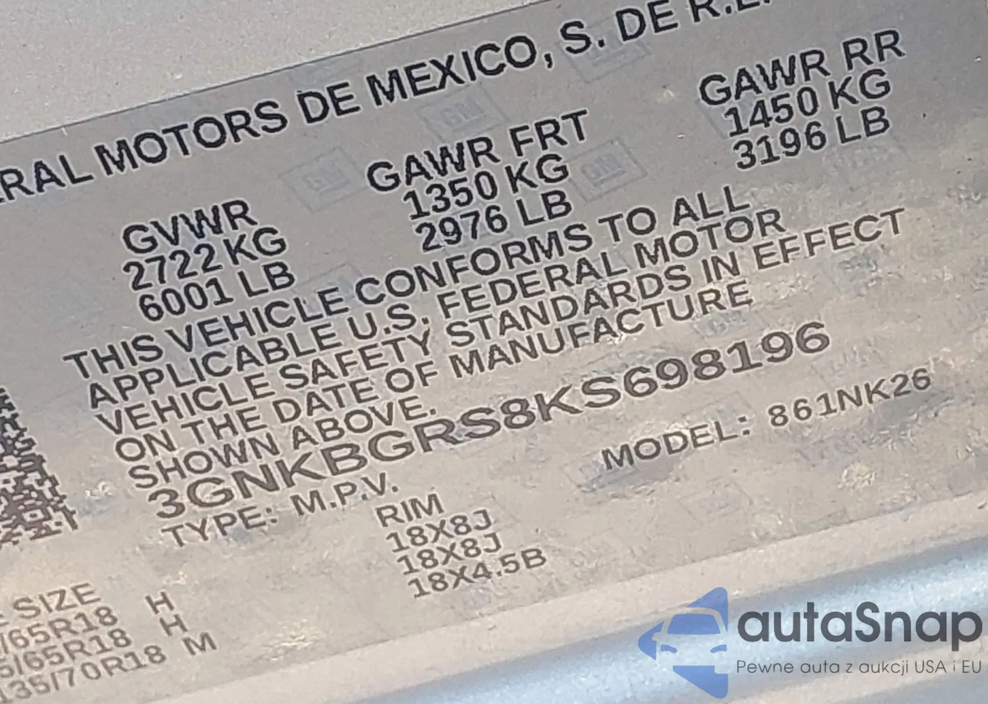 LOT: 42376636 VIN: 3GNKBGRS8KS698196