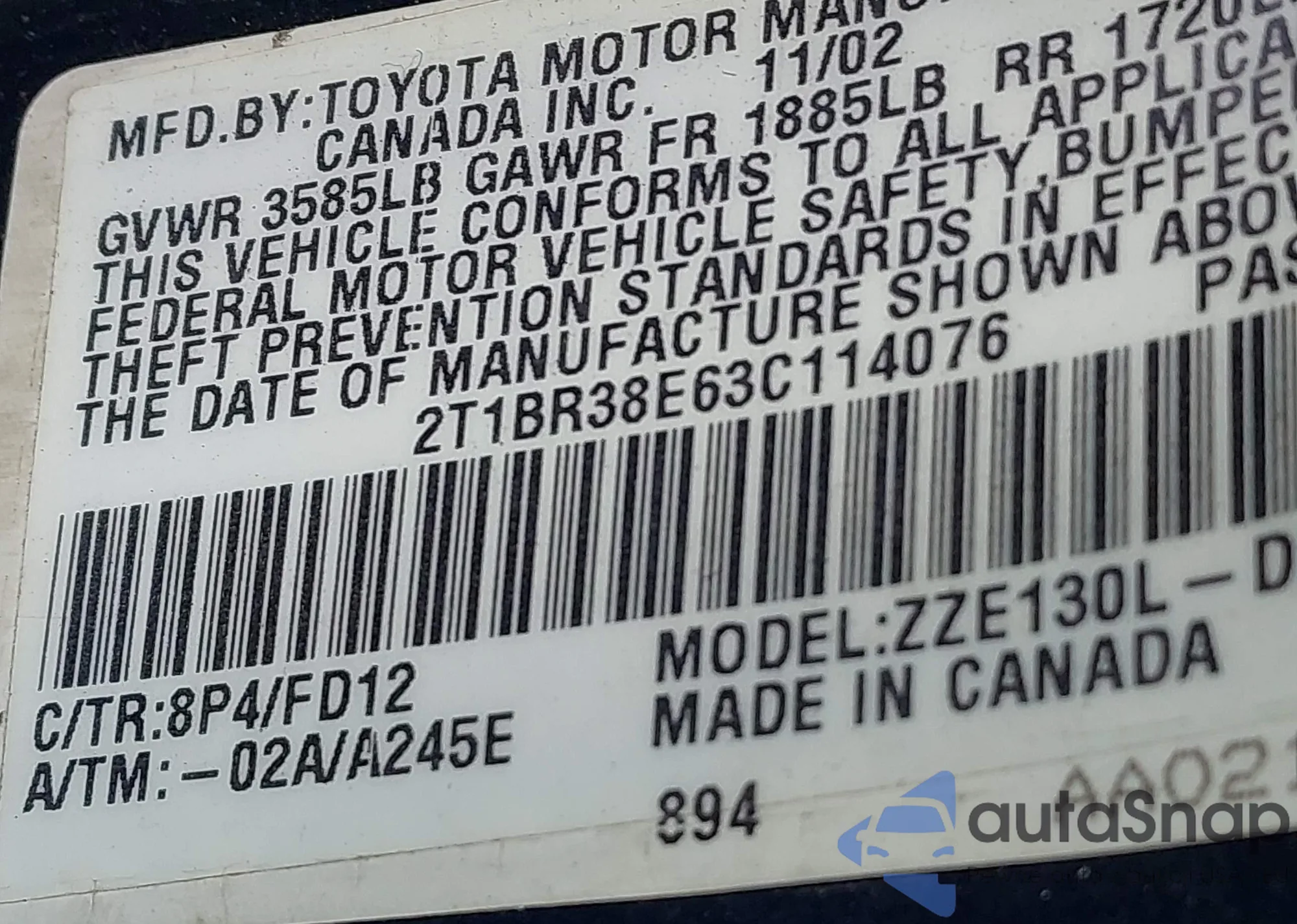 • VIN 2T1BR38E63C114076
