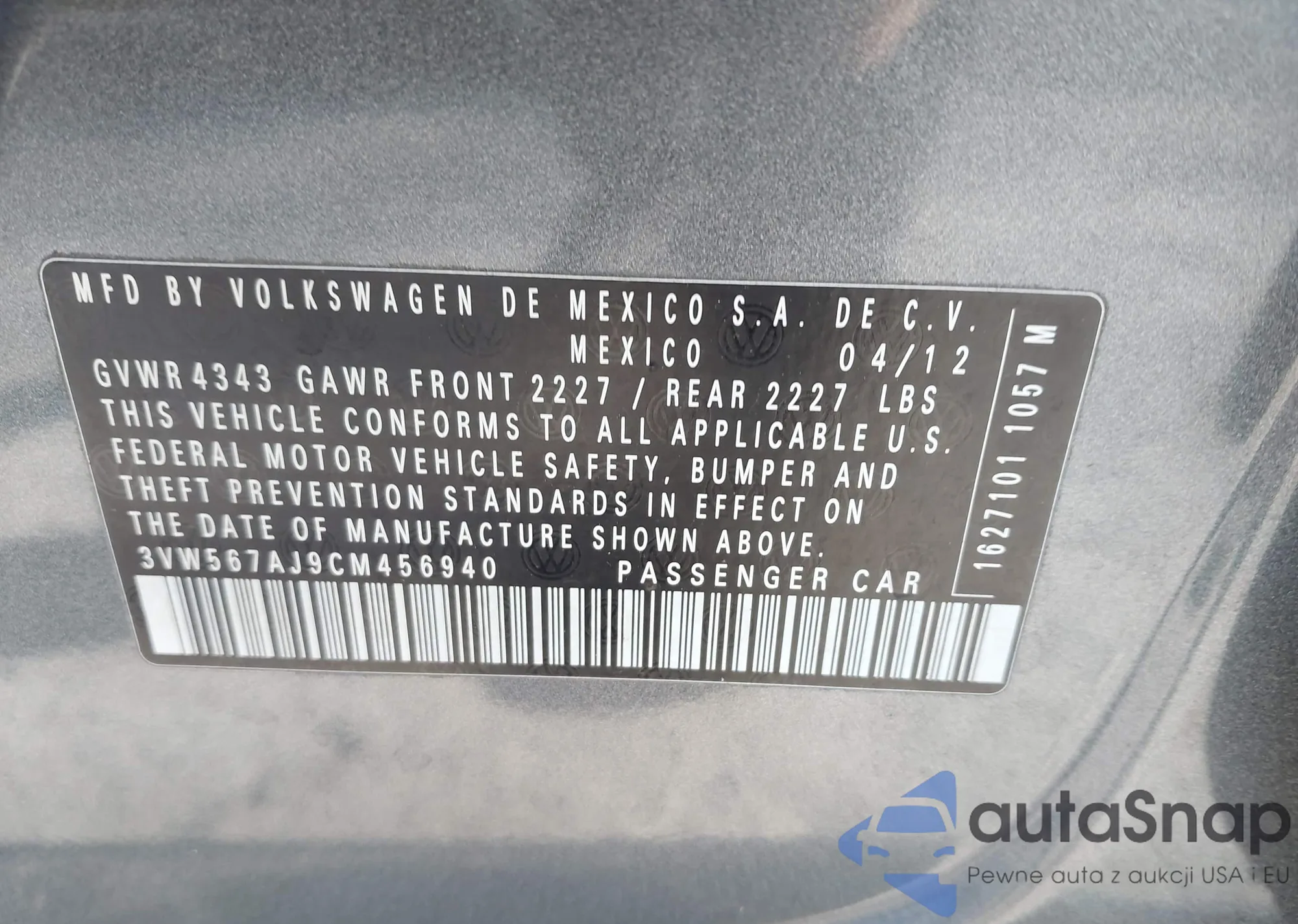 • VIN 3VW567AJ9CM456940