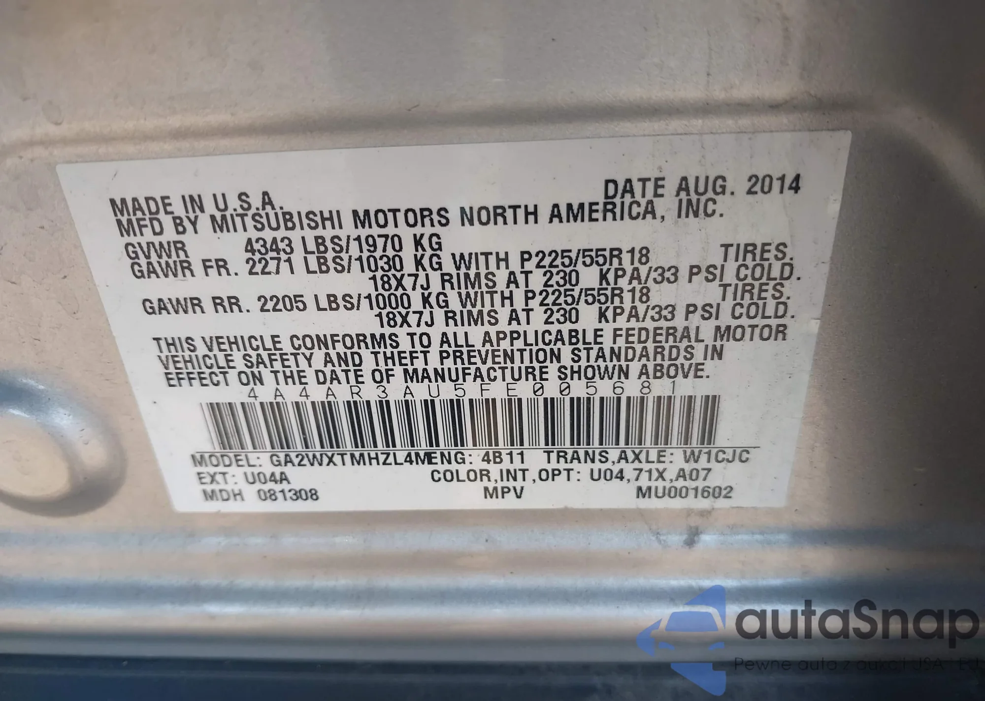 LOT: 43133263 VIN: 4A4AR3AU5FE005681