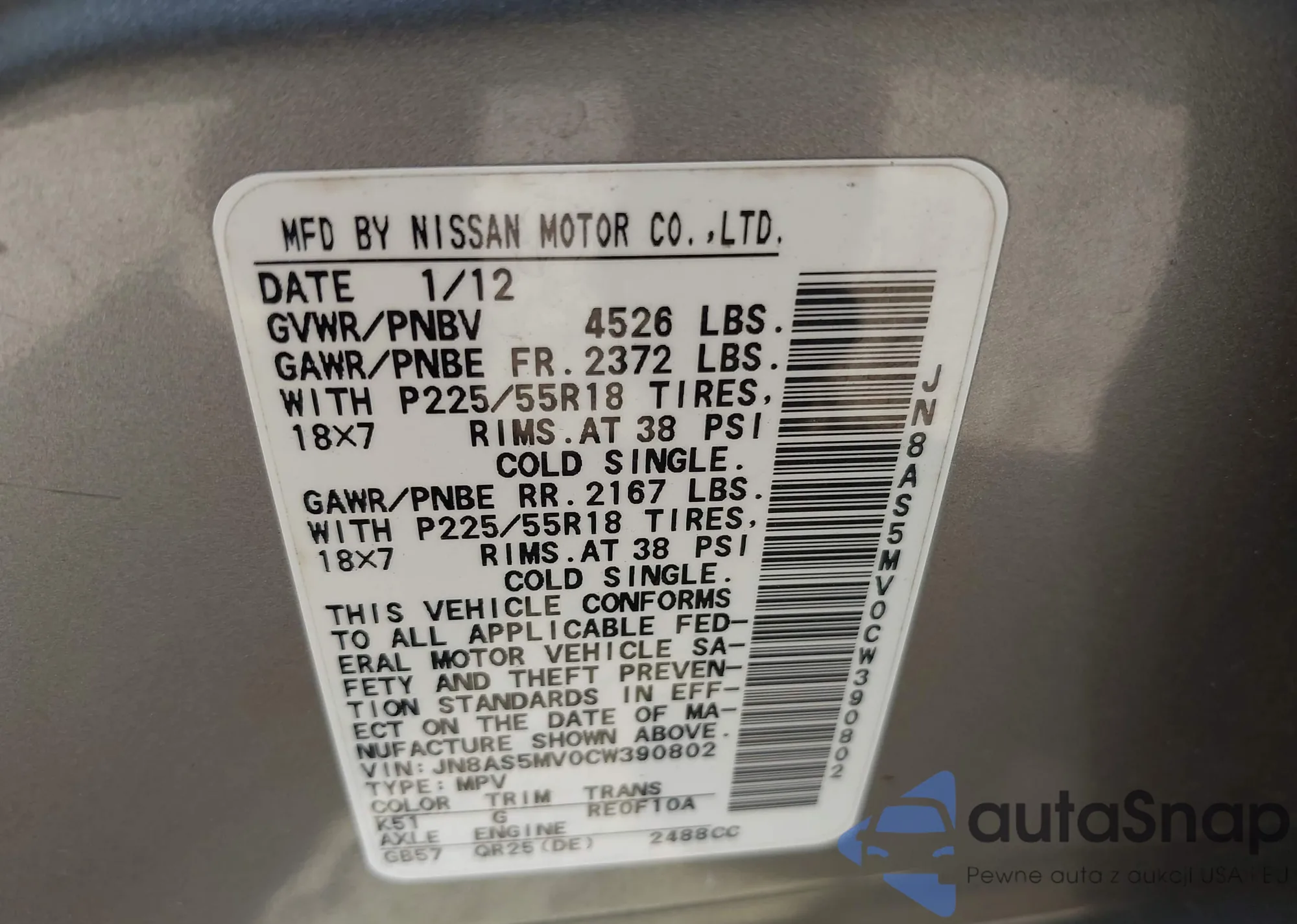 LOT: 42947756 VIN: 1N4BL4DW6RN413231