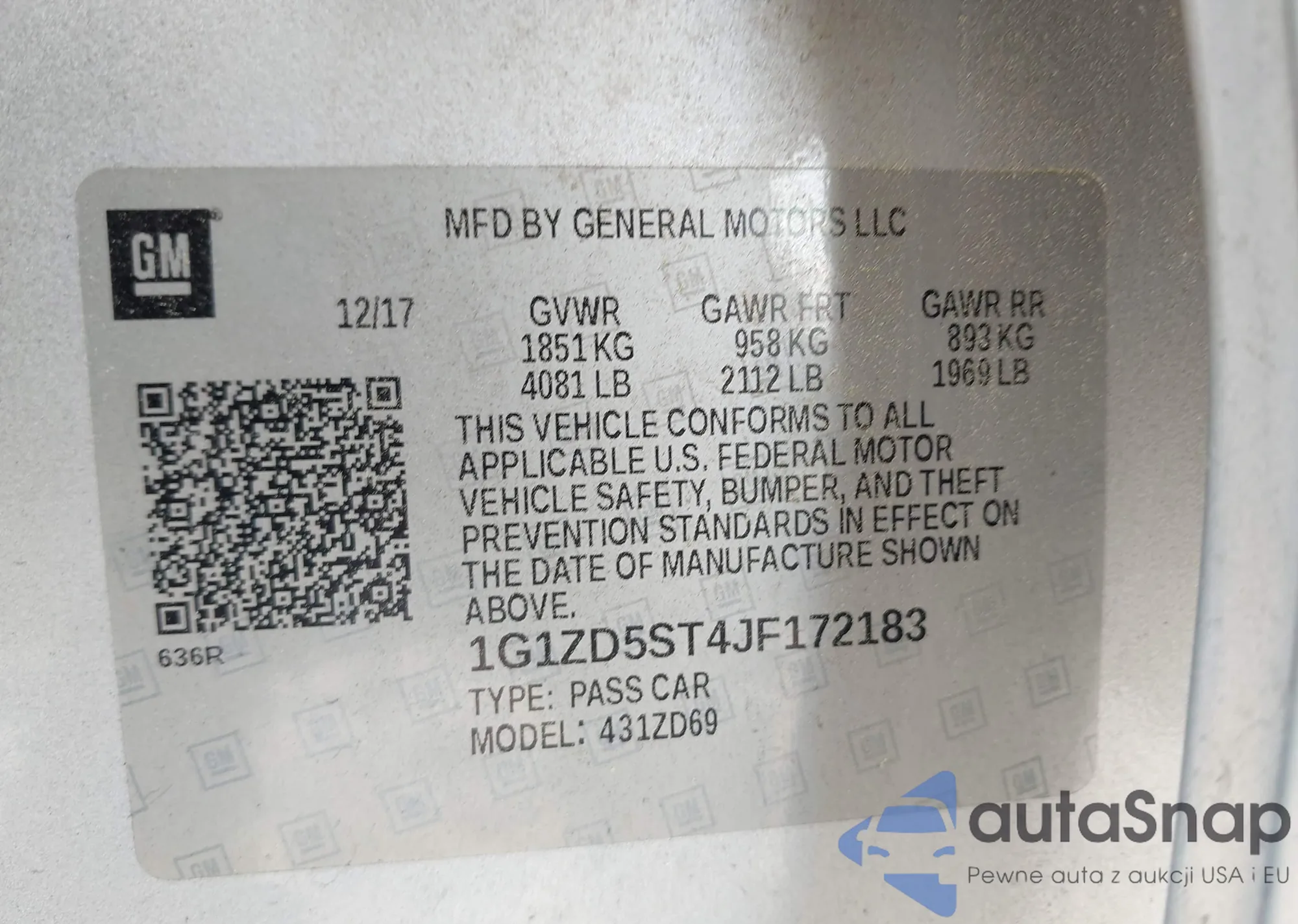 LOT: 42025338 VIN: 1G1ZD5ST4JF172183