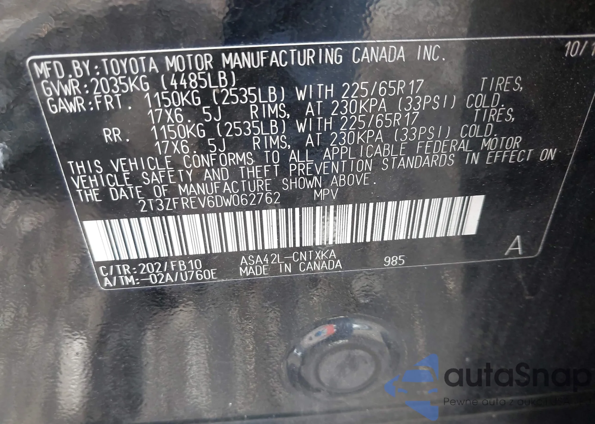 • VIN 2T3ZFREV6DW062762