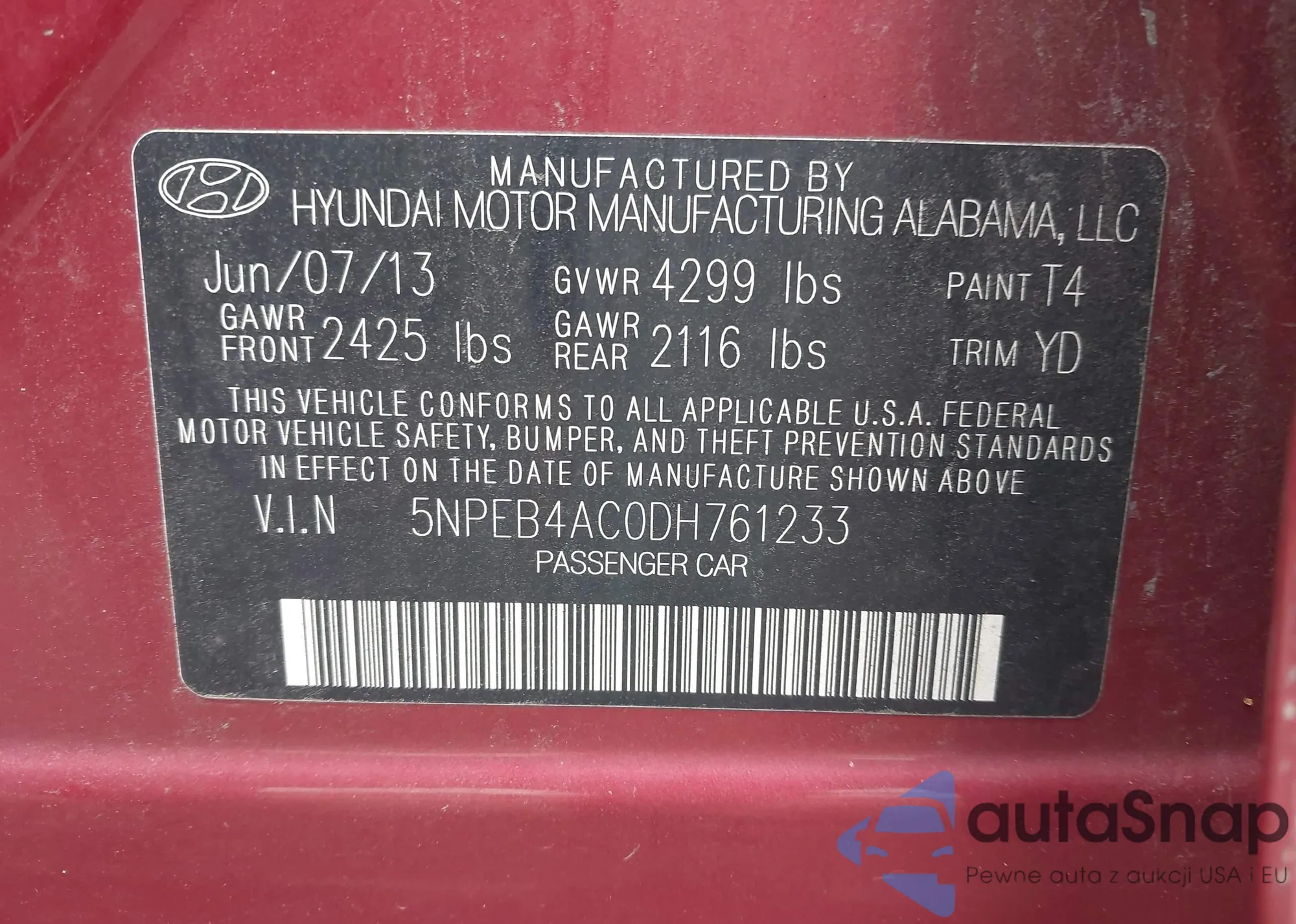 LOT: 43053432 VIN: 5NPEB4AC0DH761233