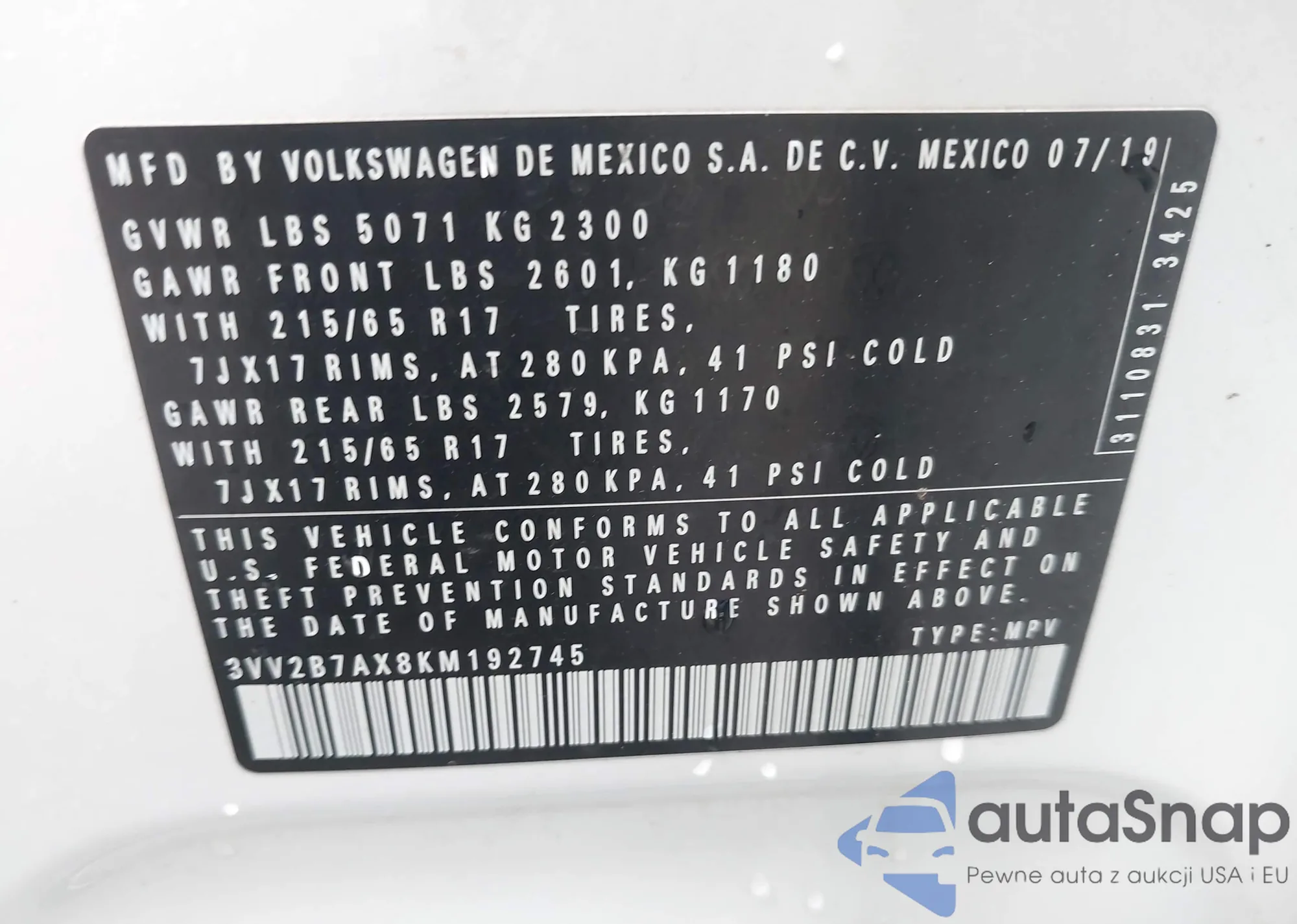 • VIN 3VV2B7AX8KM192745