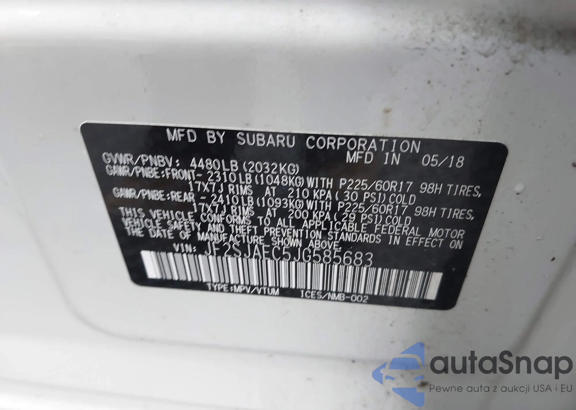 LOT: 42628721 VIN: JF2SJAEC5JG585683