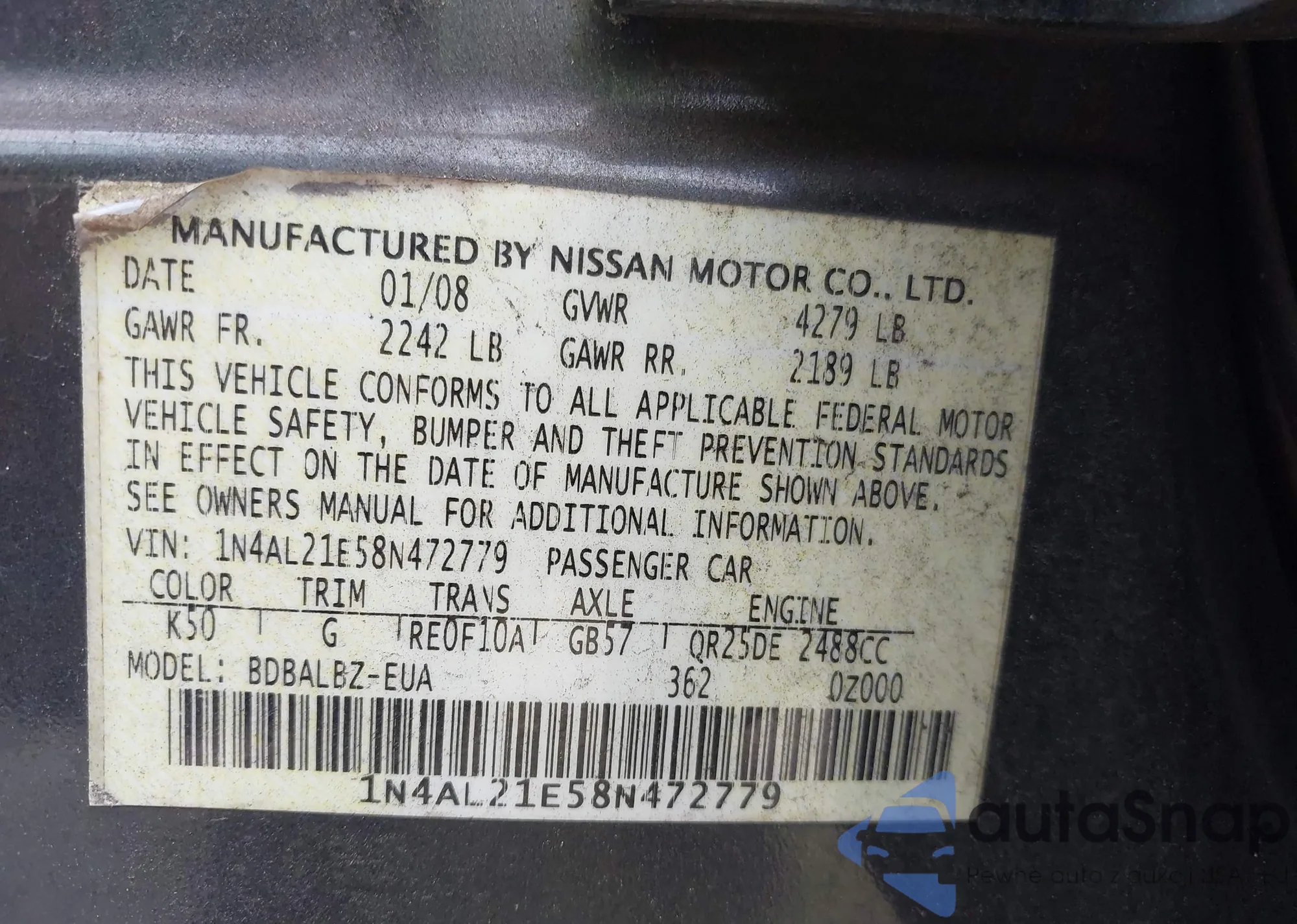 LOT: 43079229 VIN: 1N4AL21E58N472779