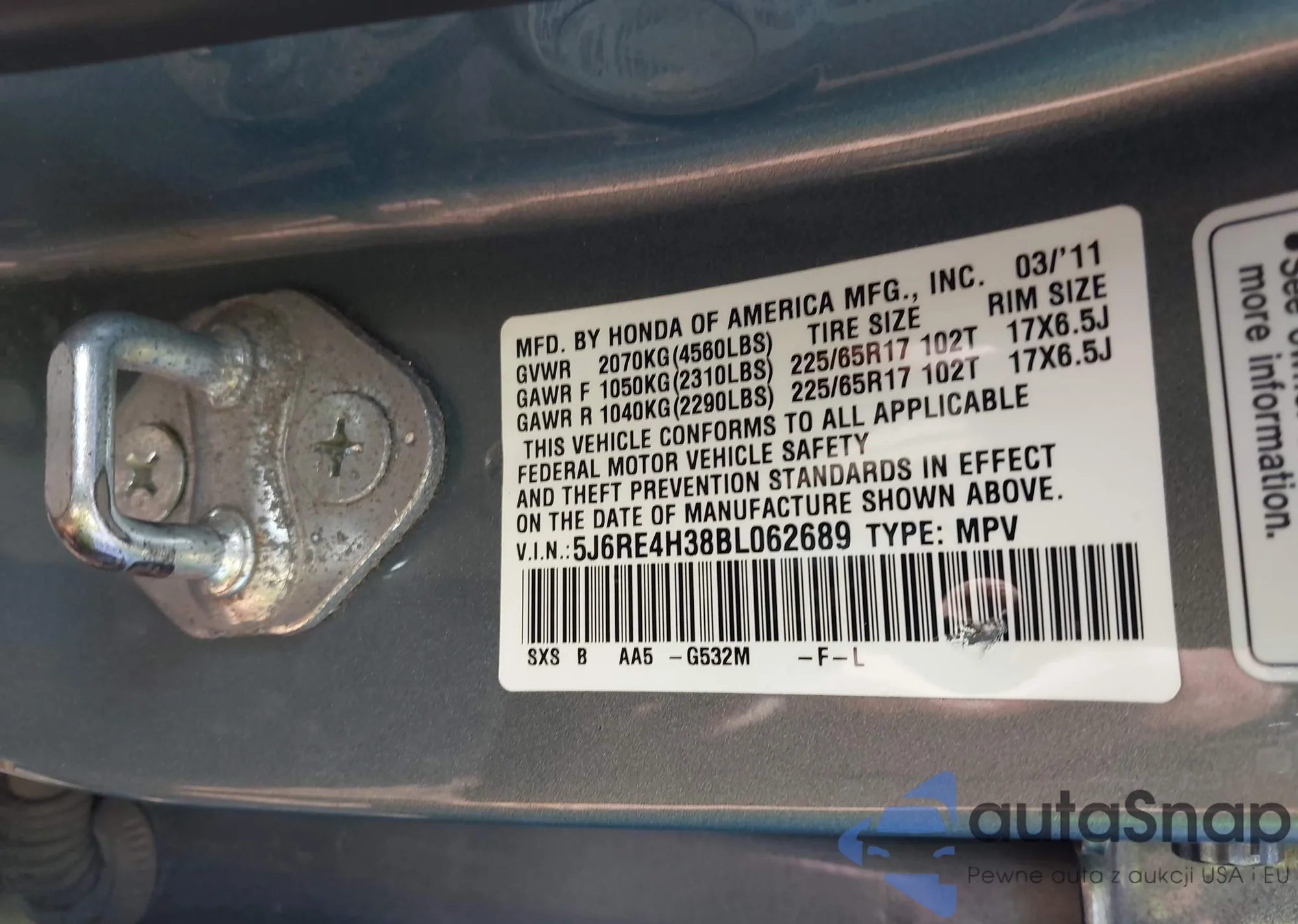• VIN 5J6RE4H38BL062689