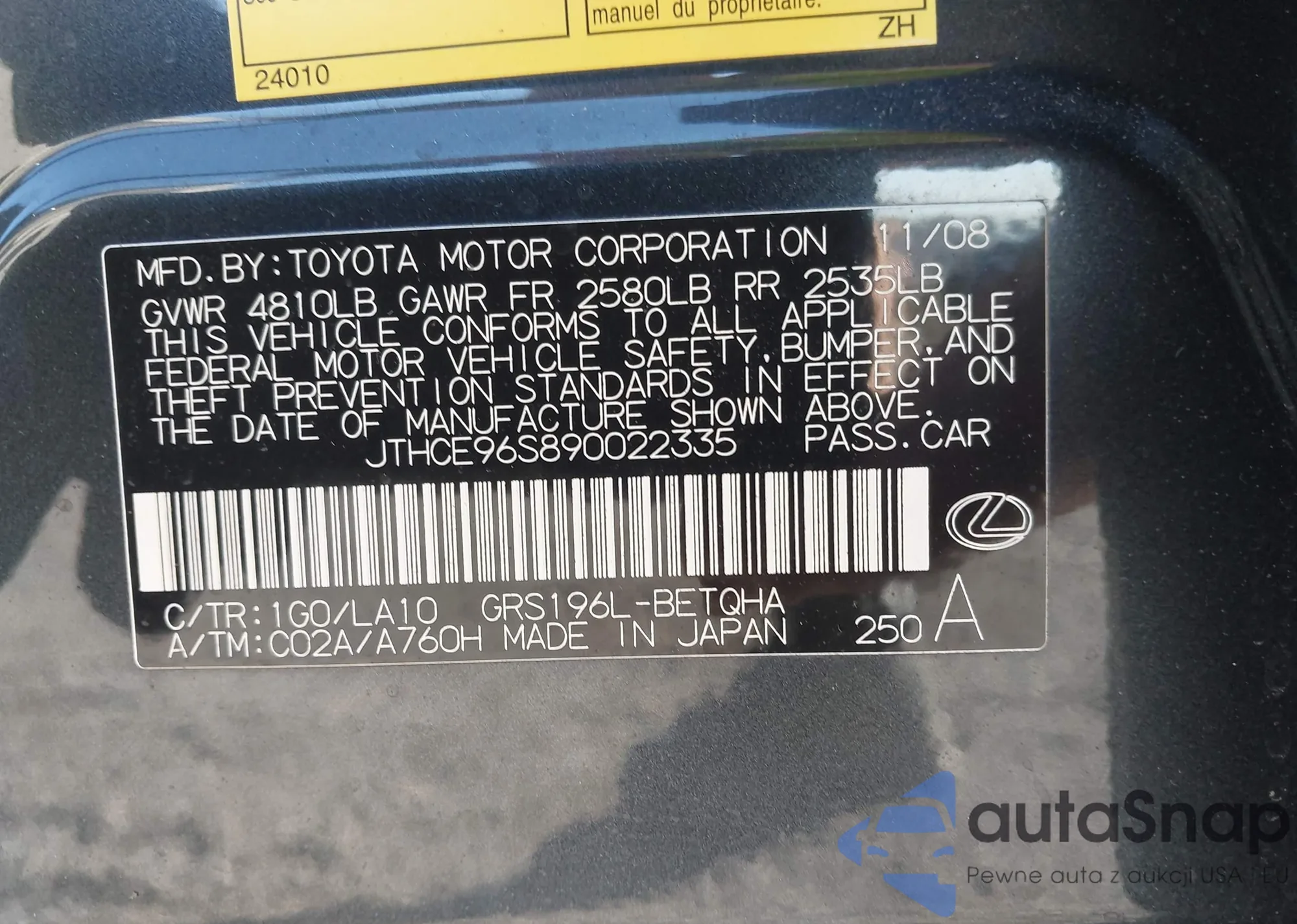 LOT: 43078184 VIN: JTHCE96S890022335