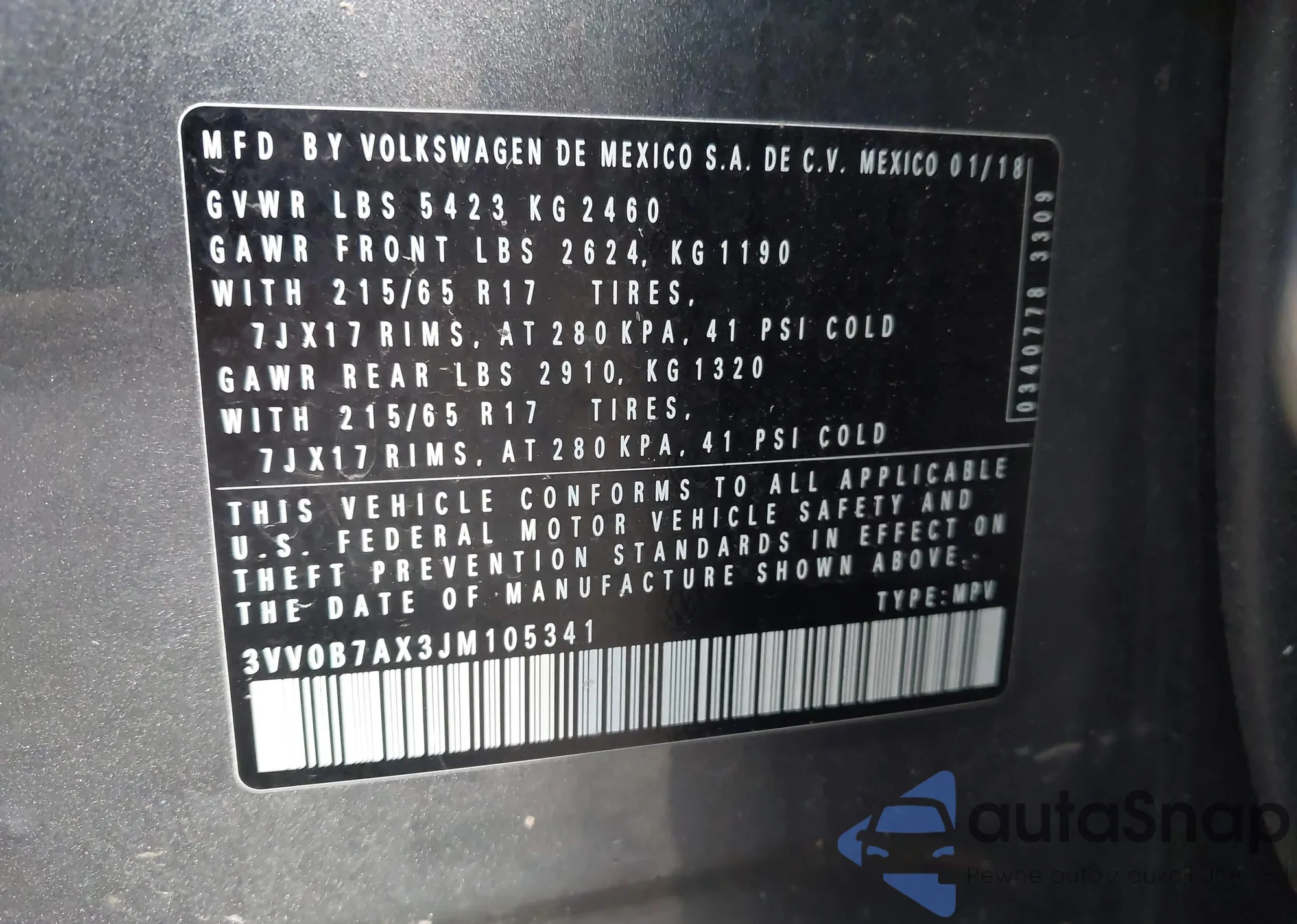 • VIN 3VV0B7AX3JM105341