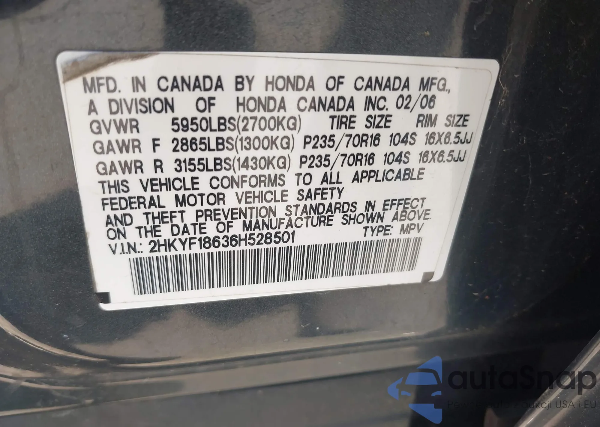 • VIN 5FNYF4H52BB099899