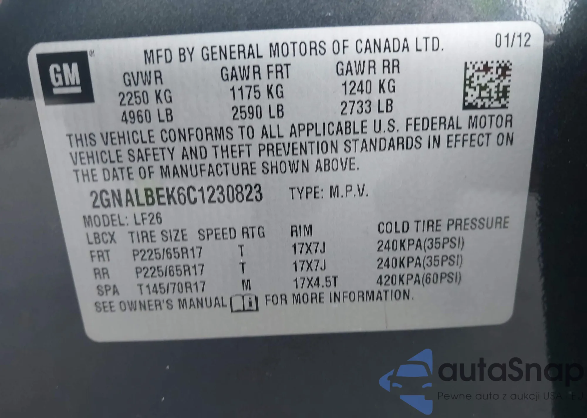 LOT: 43152931 VIN: 2GNALBEK6C1230823
