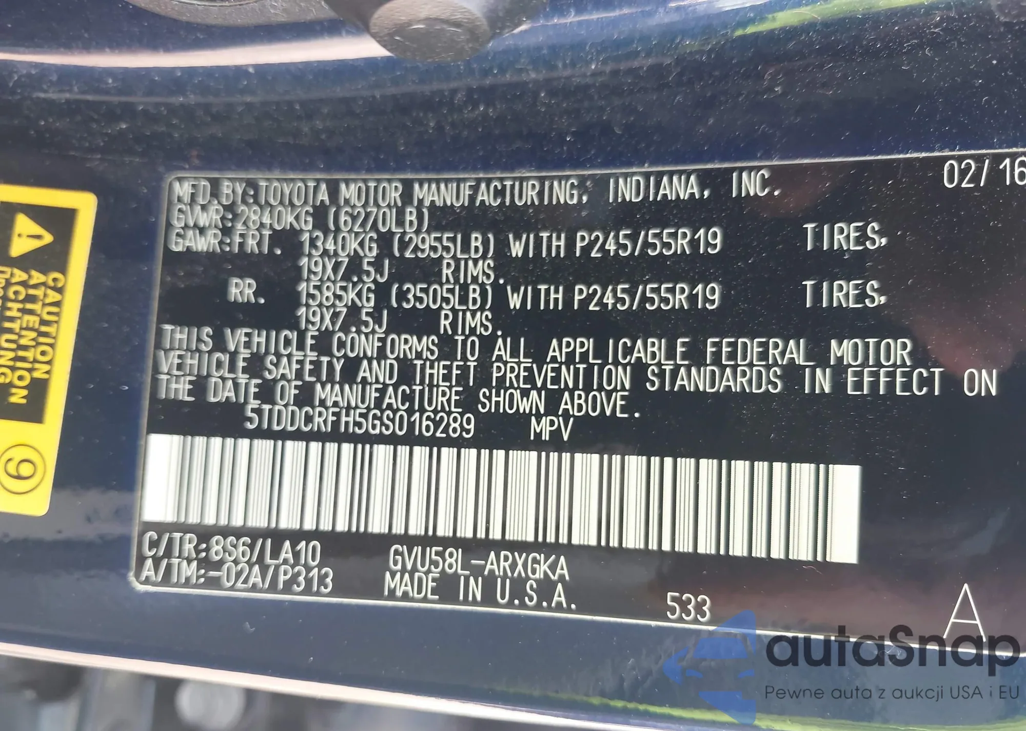 • VIN 5TDDCRFH5GS016289