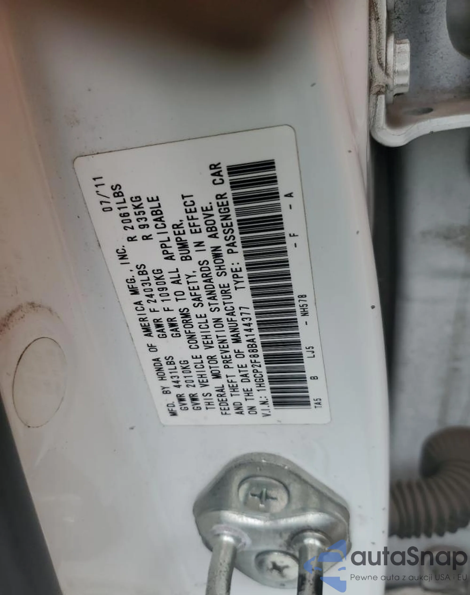 LOT: 66963565 VIN: 1HGCP2F88BA144377