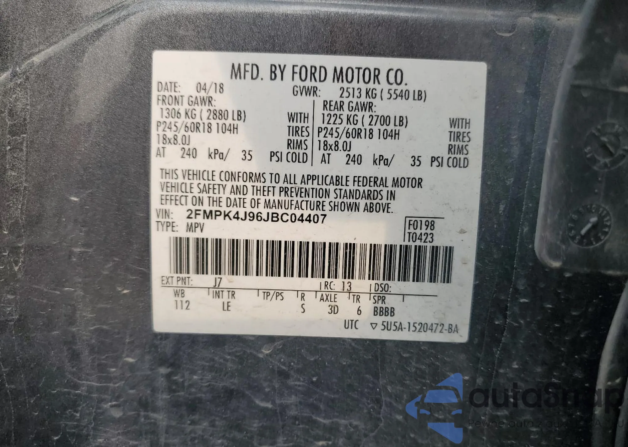 LOT: 67206205 VIN: 2FMPK4J96JBC04407