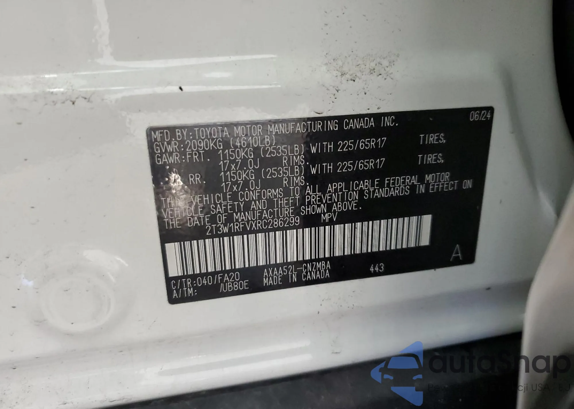 LOT: 69968255 VIN: 2T3W1RFVXRC286299