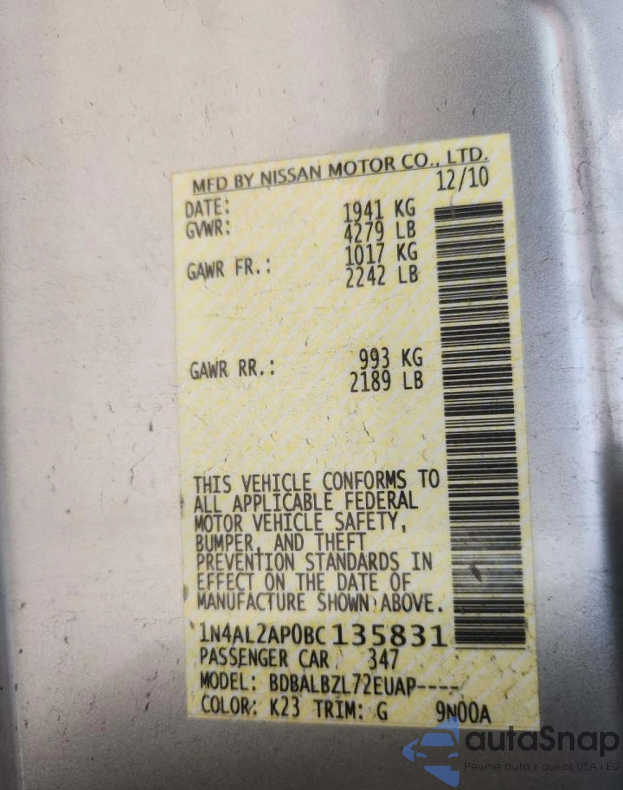 LOT: 71660515 VIN: 1N4AL2AP0BC135831