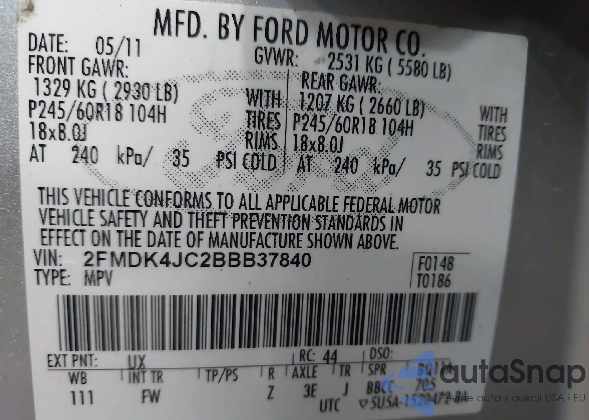 LOT: 43002096 VIN: 2FMDK4JC2BBB37840
