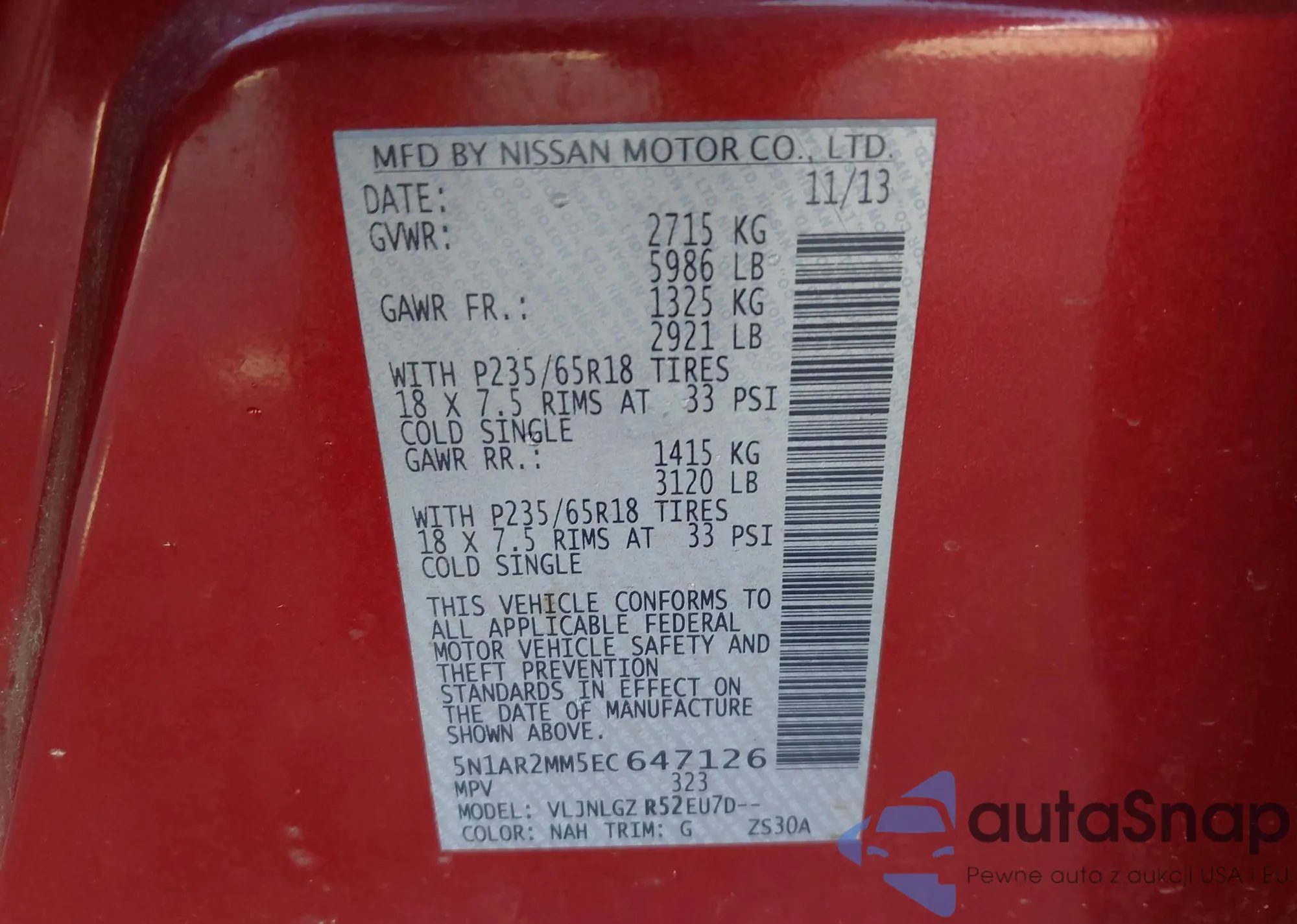 LOT: 43008646 VIN: 5N1AR2MM5EC647126