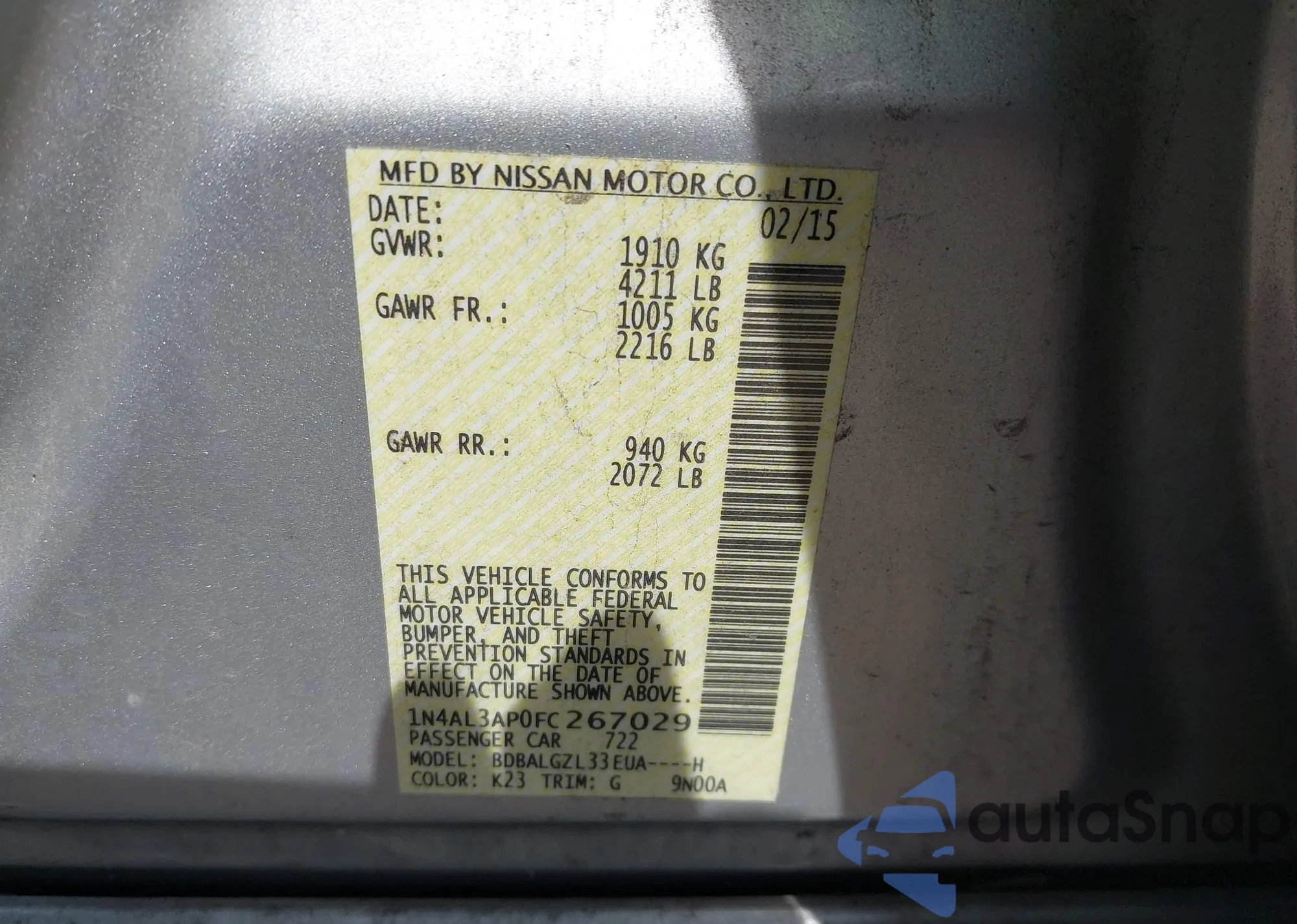 LOT: 42700724 VIN: 1N4AL3AP0FC267029