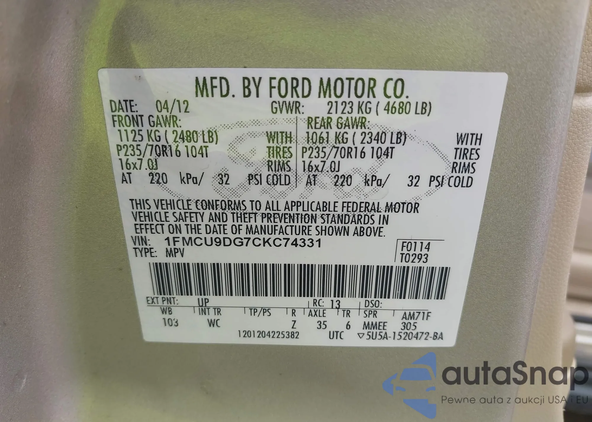 • VIN 1FMCU9DG7CKC74331