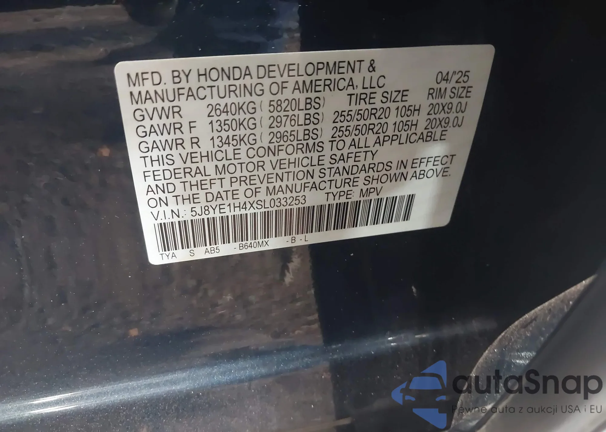 • VIN 5J6RE48797L016802