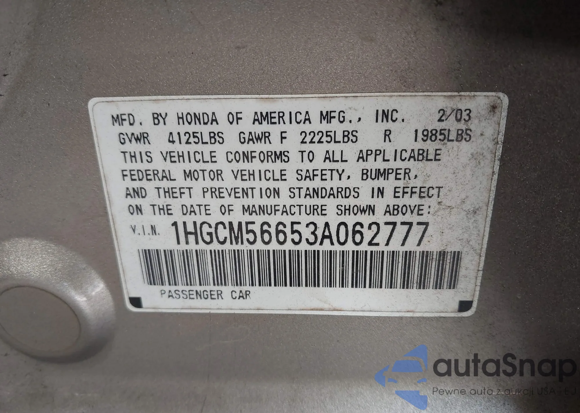 LOT: 42874103 VIN: 1HGCM56653A062777