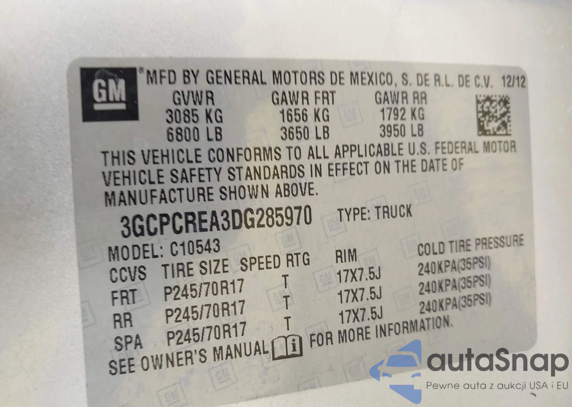 LOT: 43182821 VIN: 3GCPCREA3DG285970