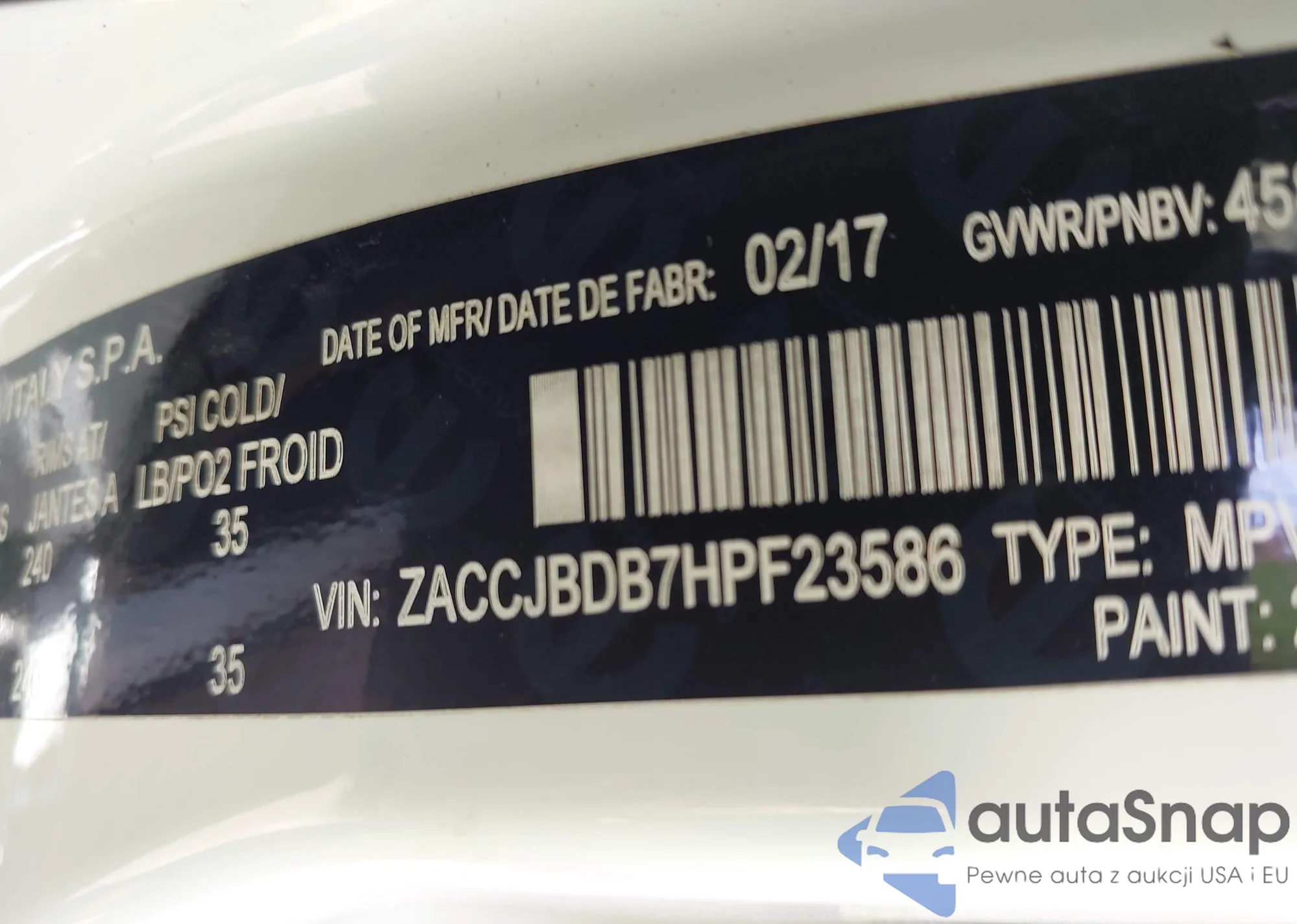 LOT: 43007600 VIN: ZACCJBDB7HPF23586