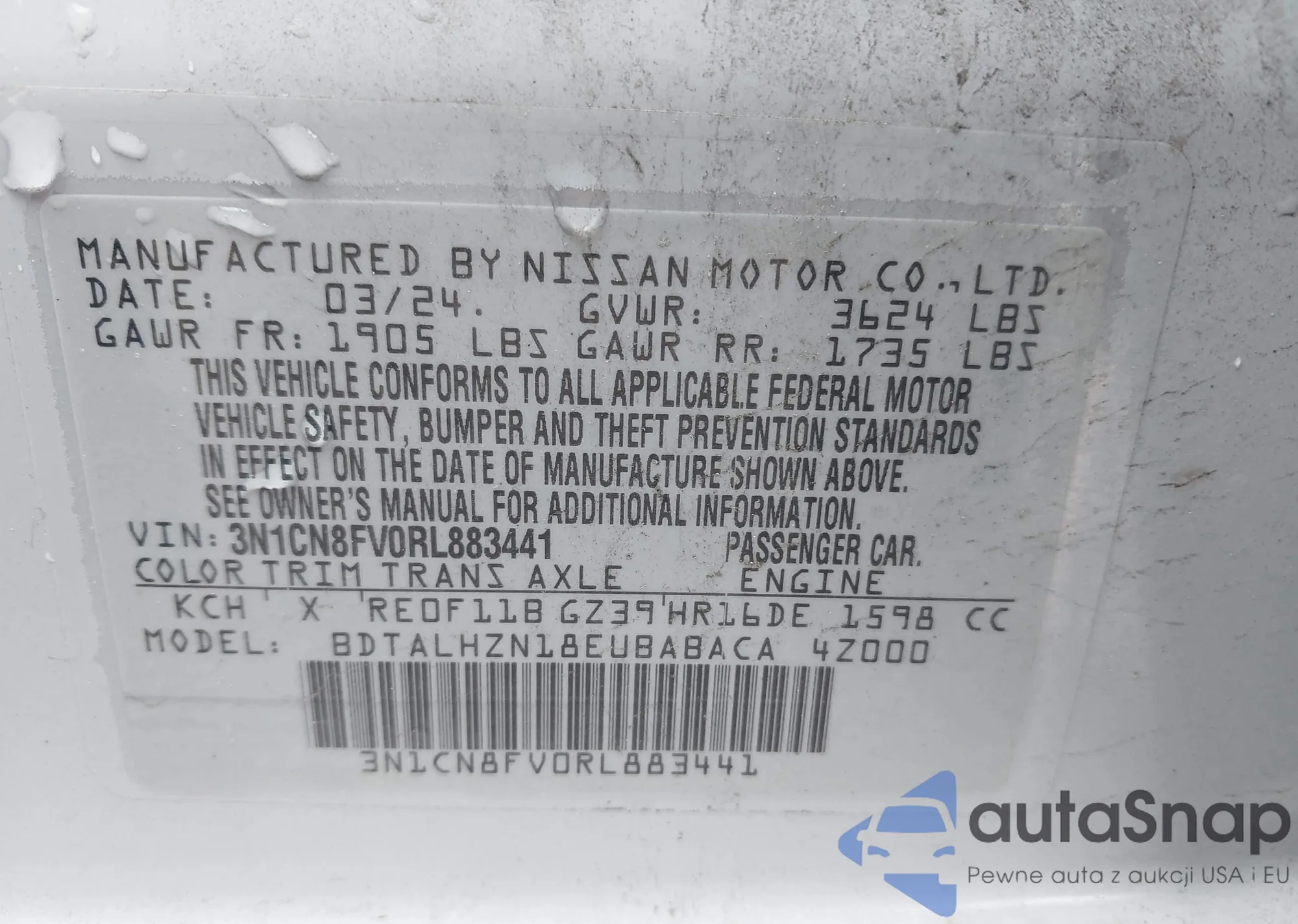• VIN 3N1CN8FV0RL883441