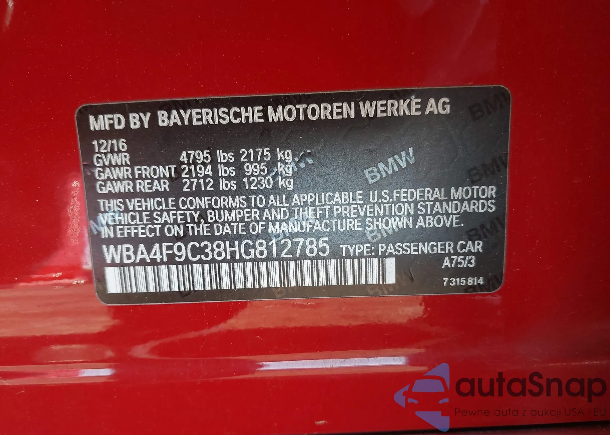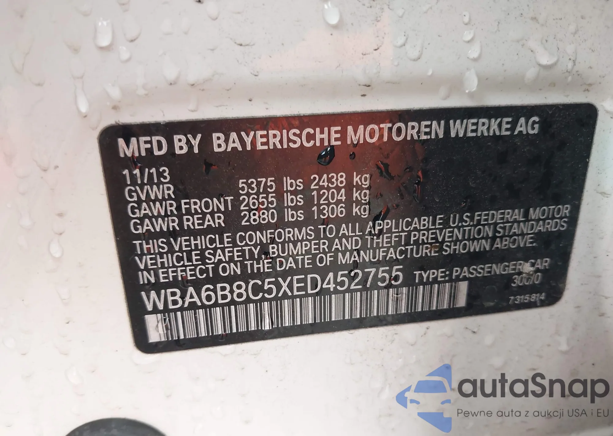 LOT: 42272624 VIN: WBA6B8C5XED452755