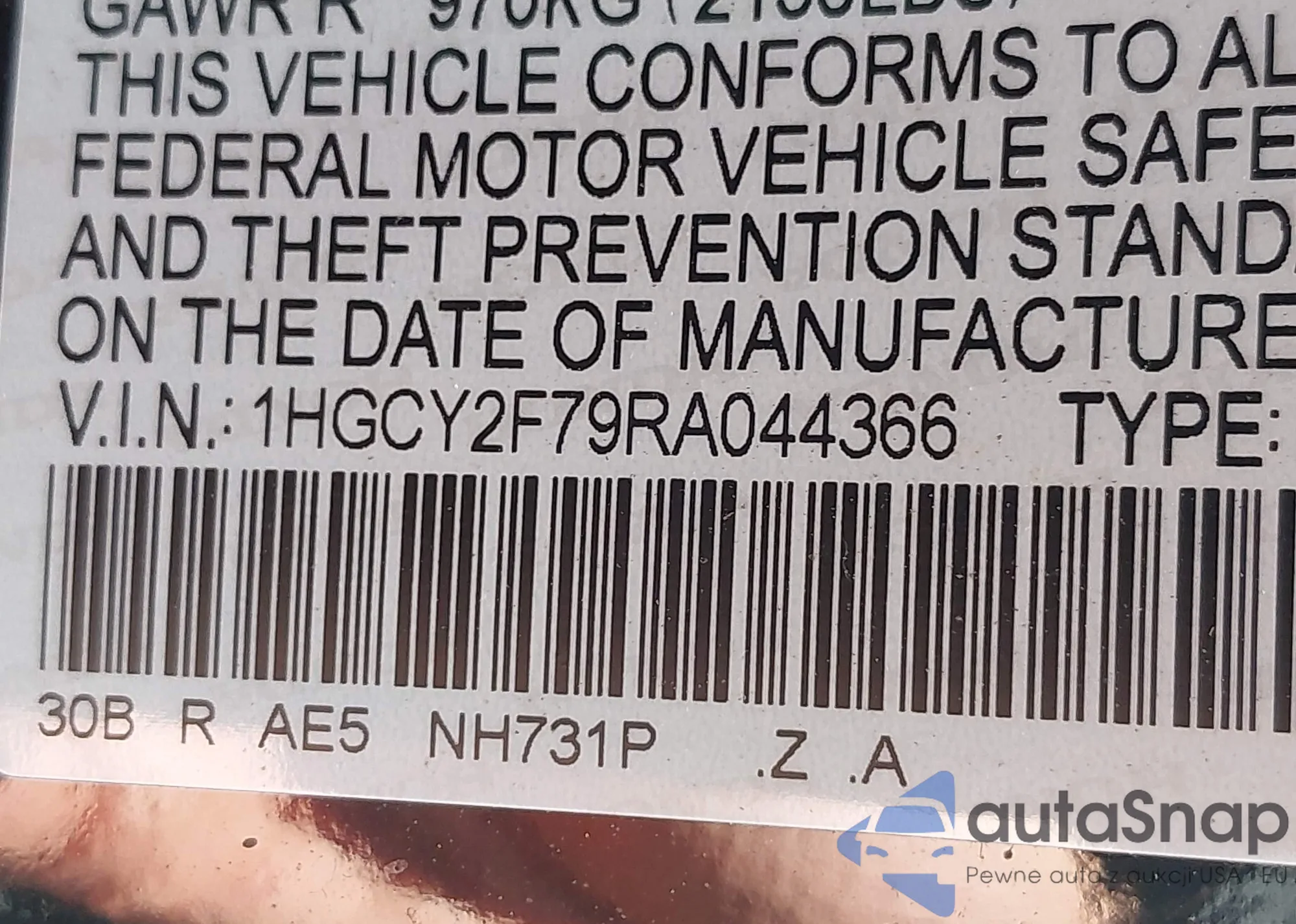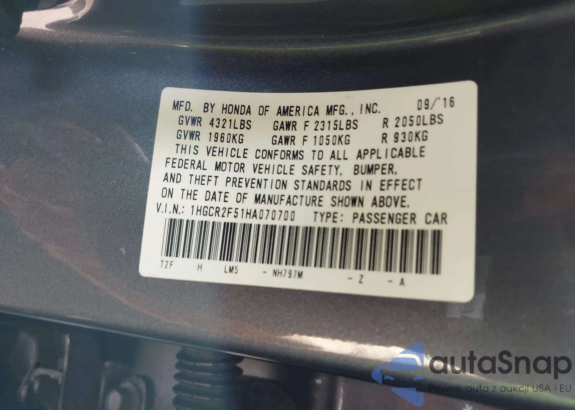 LOT: 43041759 VIN: 1HGCR2F51HA070700