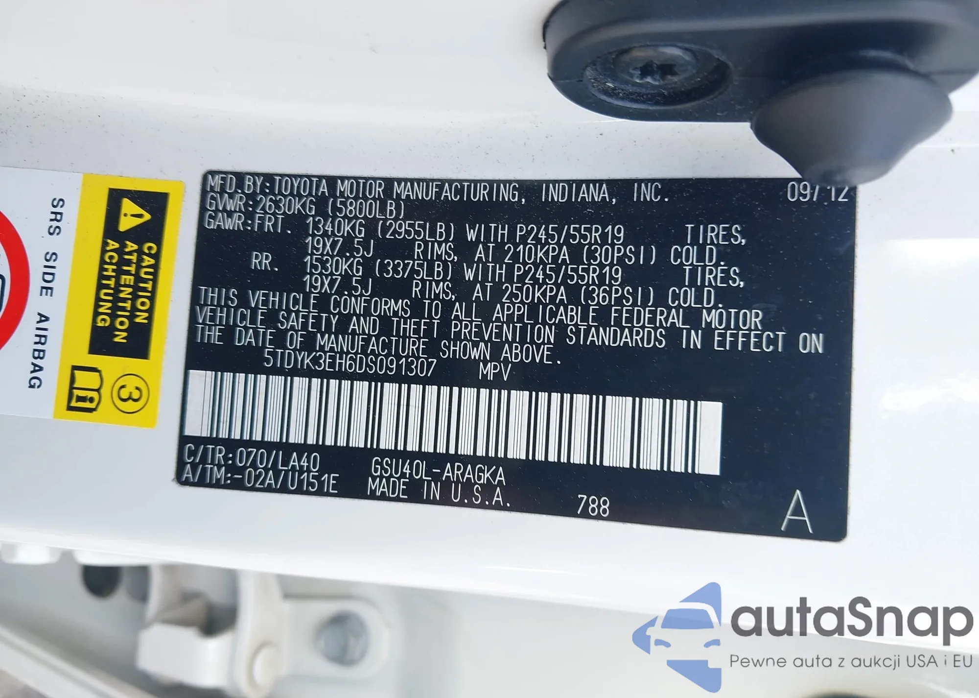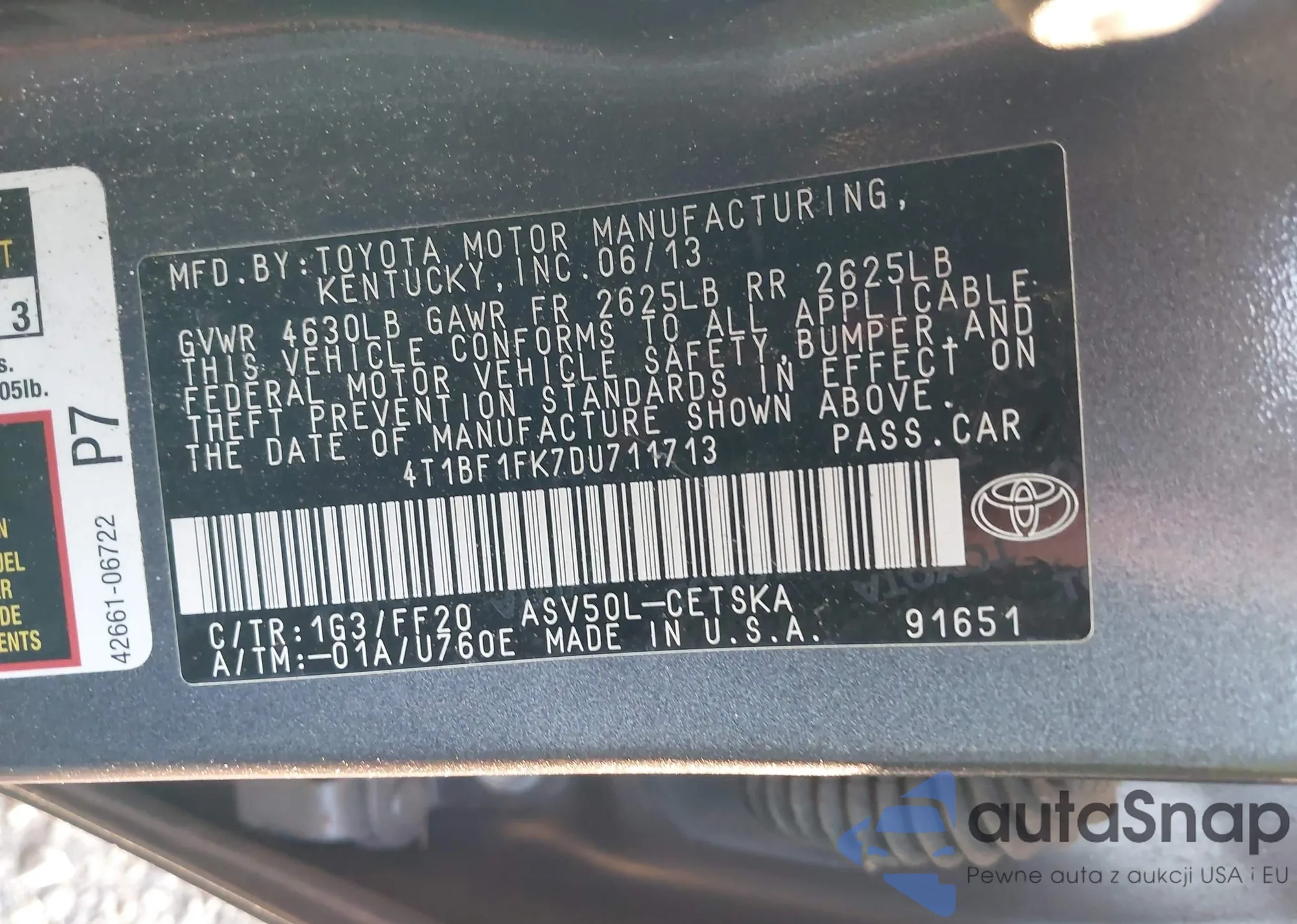 LOT: 42815425 VIN: 4T1BF1FK7DU711713