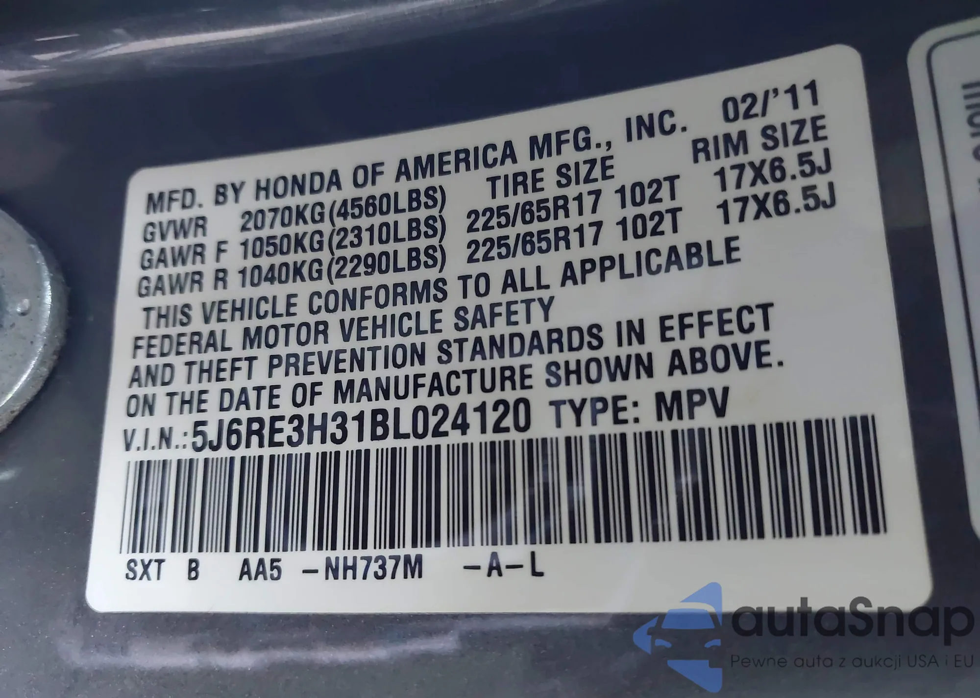 • VIN 5J6RE3H31BL024120