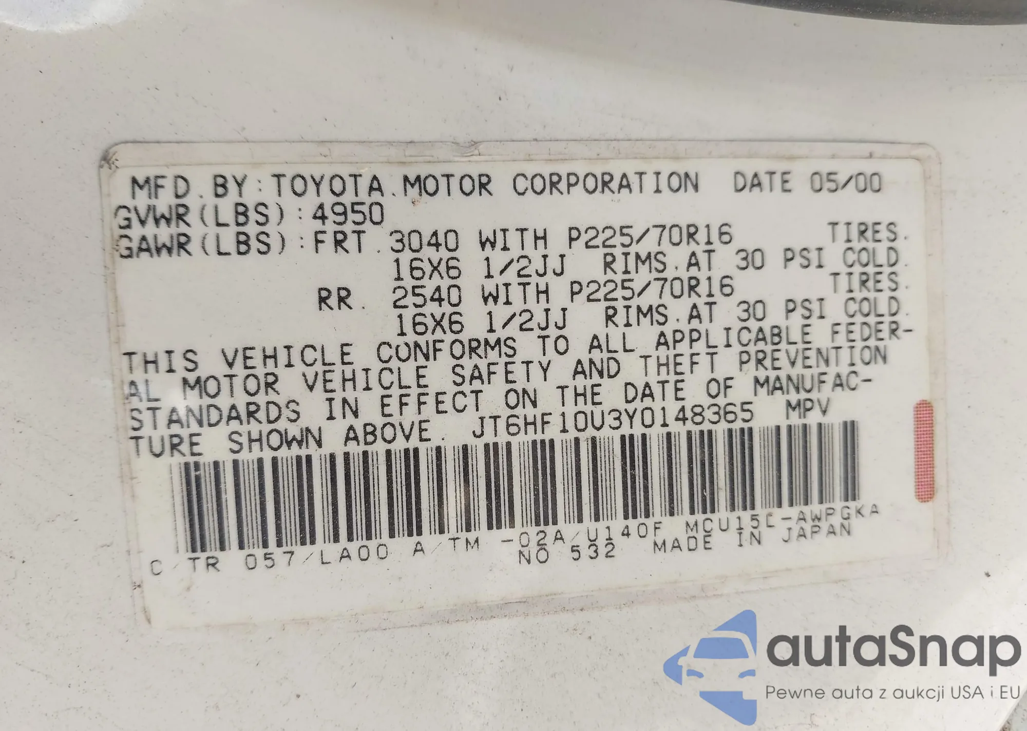 LOT: 43148876 VIN: JT6HF10U3Y0148365