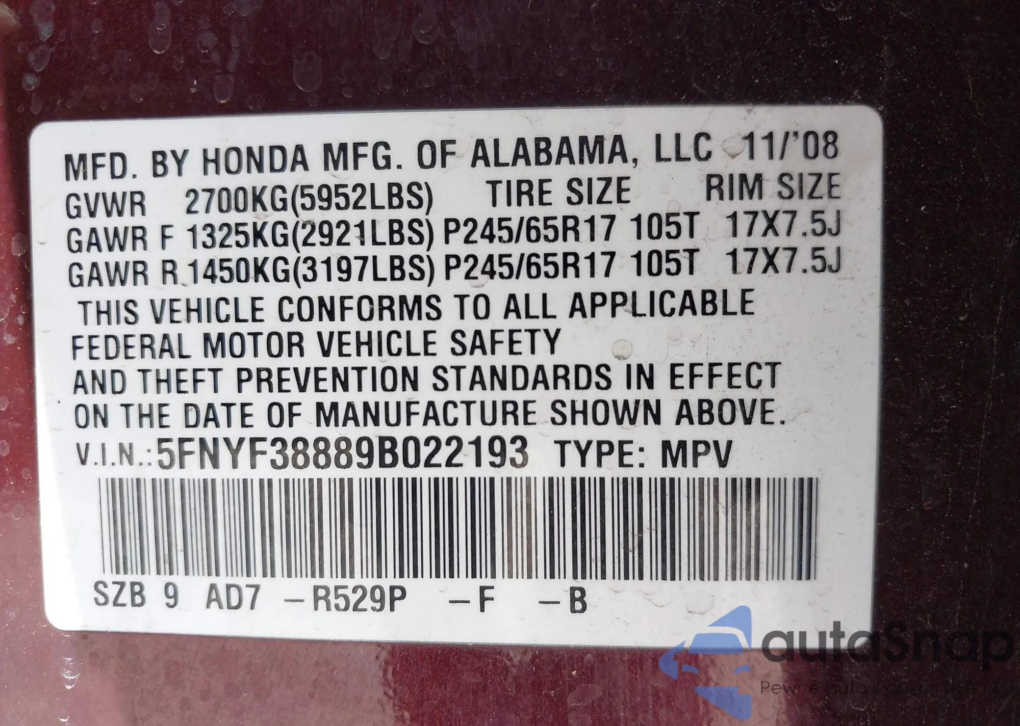 LOT: 43149262 VIN: 5FNYF38889B022193