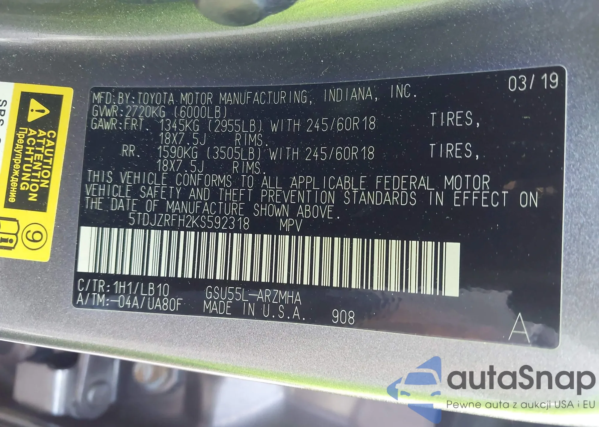 LOT: 42761614 VIN: 5TDJZRFH2KS592318