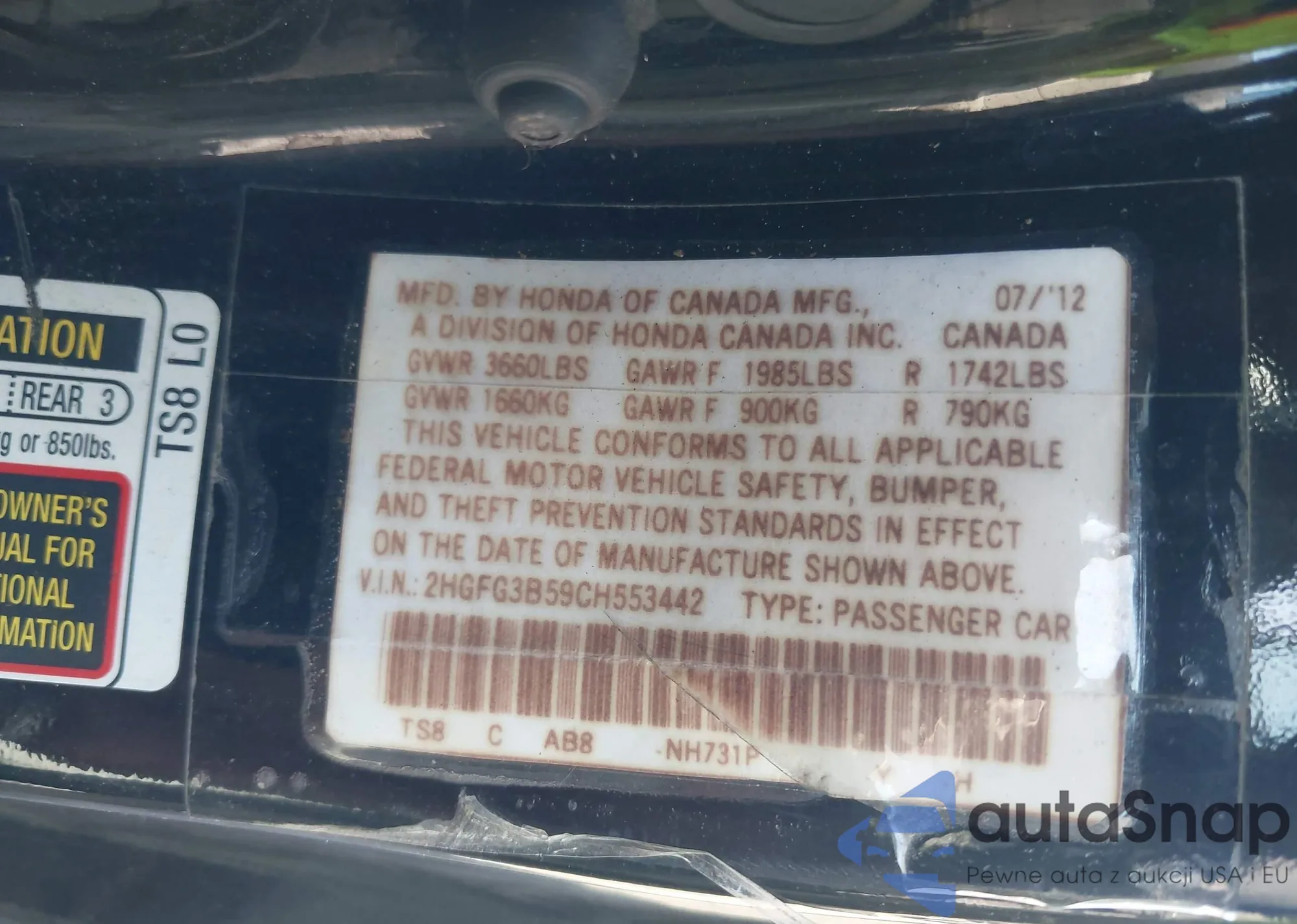• VIN 2HGFG3B59CH553442
