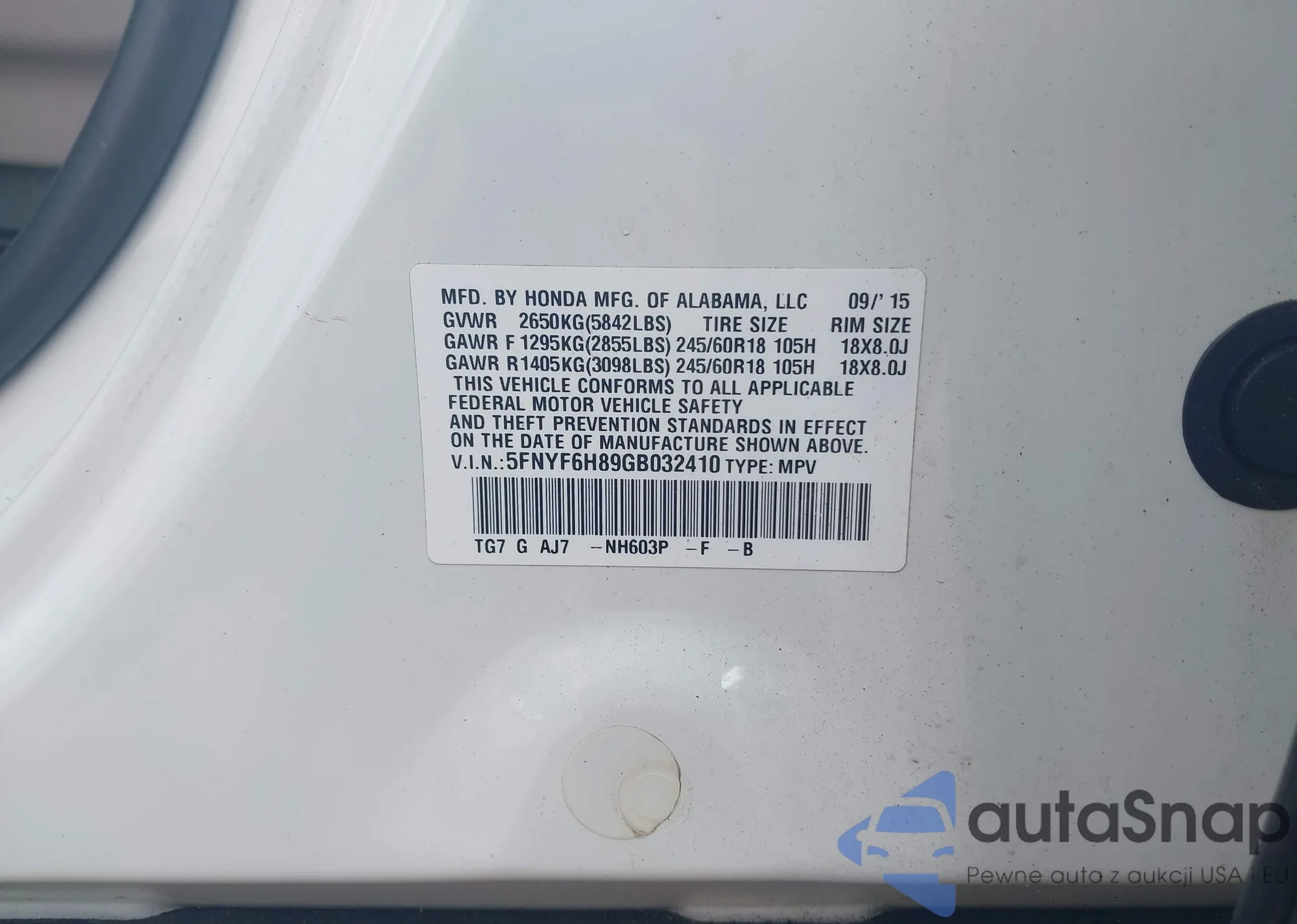 • VIN 5FNYF6H89GB032410