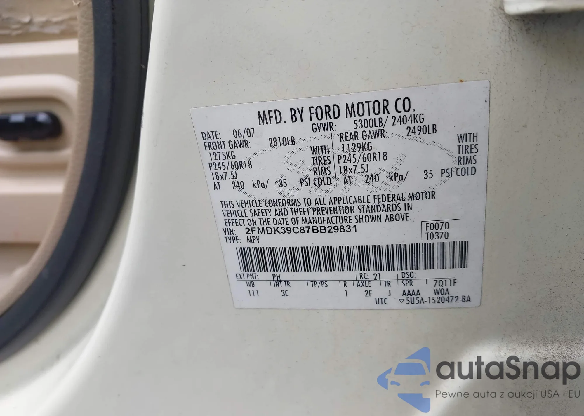 LOT: 42463791 VIN: 2FMDK39C87BB29831