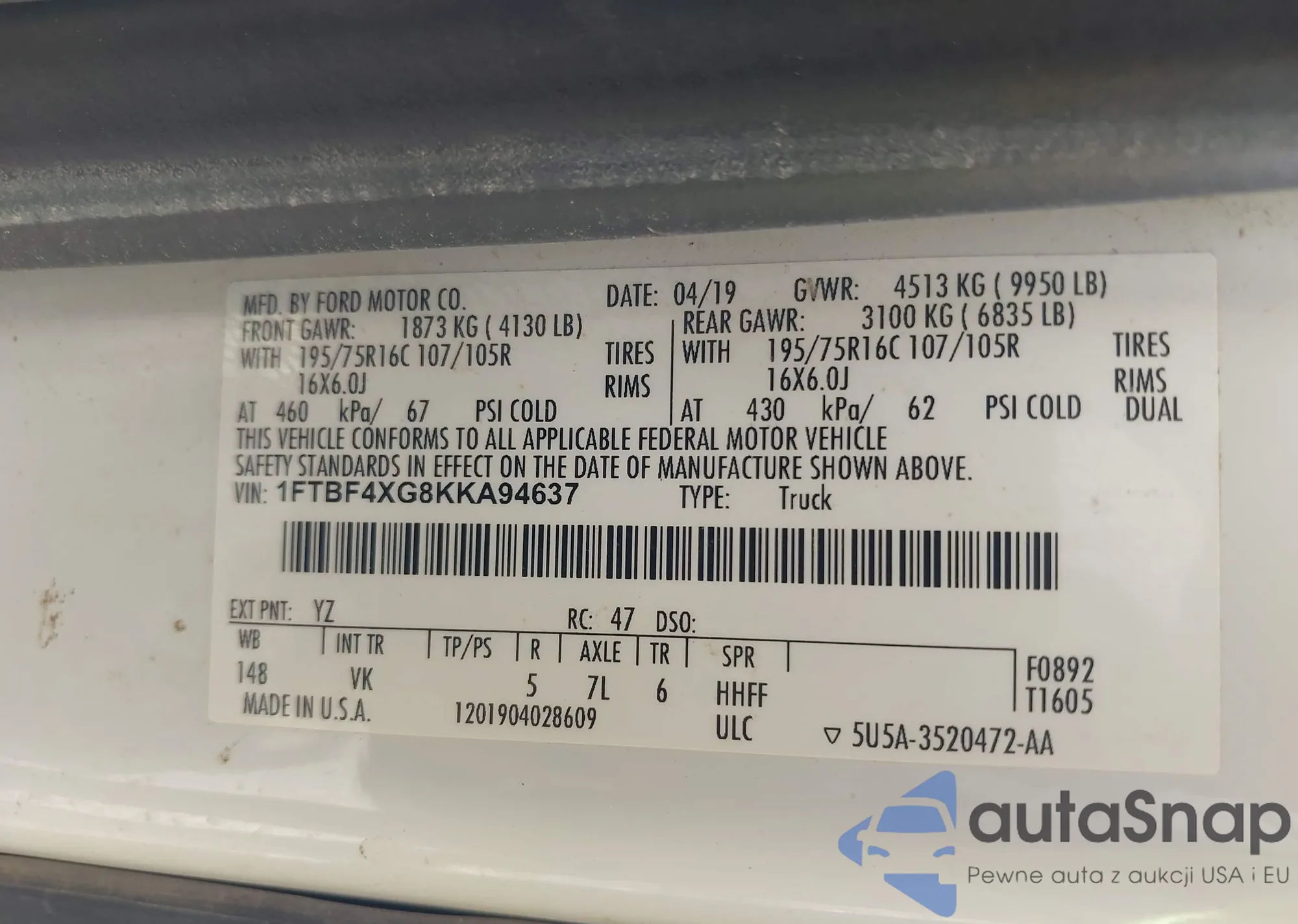 • VIN 1C4SDJCT3KC708284