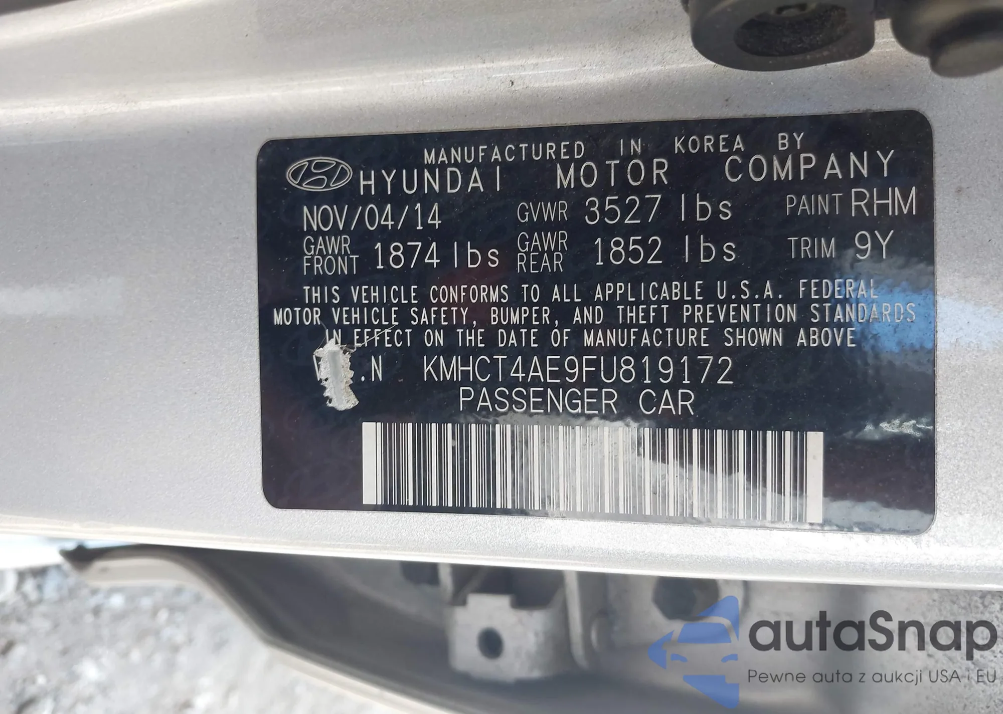 LOT: 43212940 VIN: KMHCT4AE9FU819172
