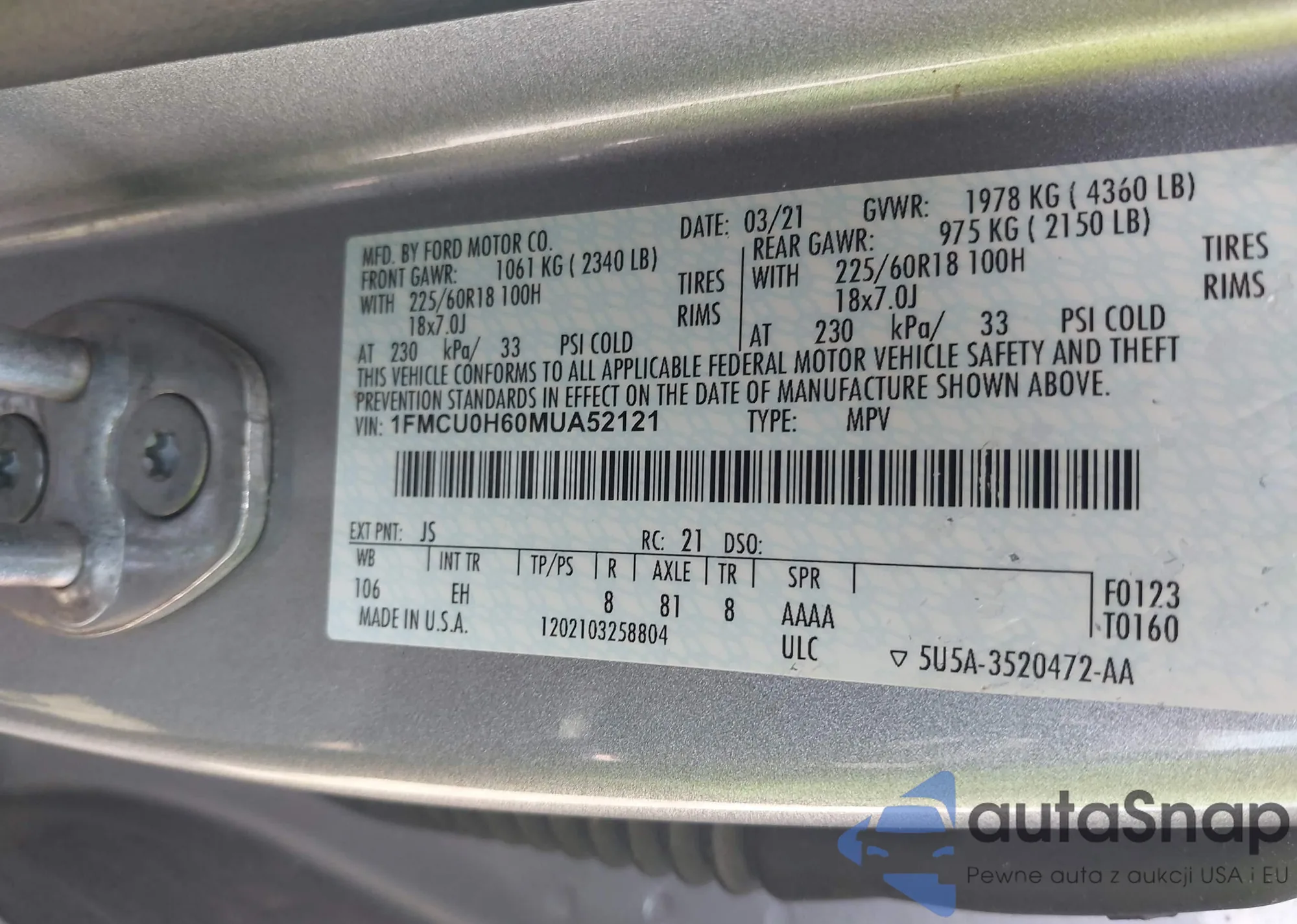 • VIN 1FMCU0H60MUA52121